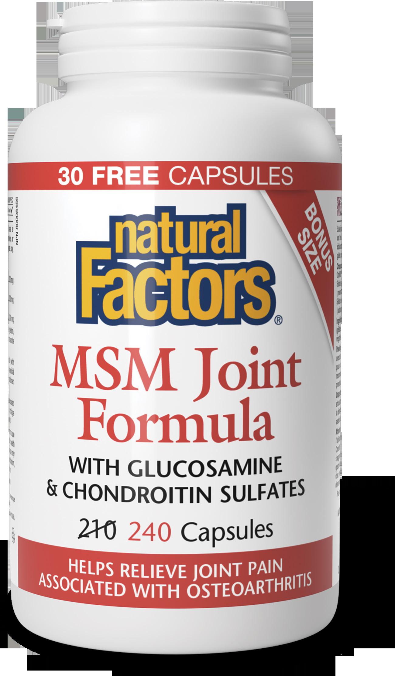 Natural Factors MSM Joint Formula contains MSM, glucosamine, and chondroitin sulphate for triple action joint health support. Combining these top three joint support nutrients in one formula improves joint lubrication, fights inflammation, and helps repair cartilage. It works to relieve joint pain associated with Osteoarthritis and protects against cartilage deterioration.