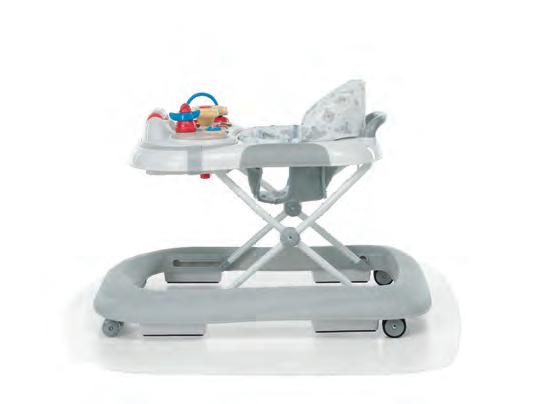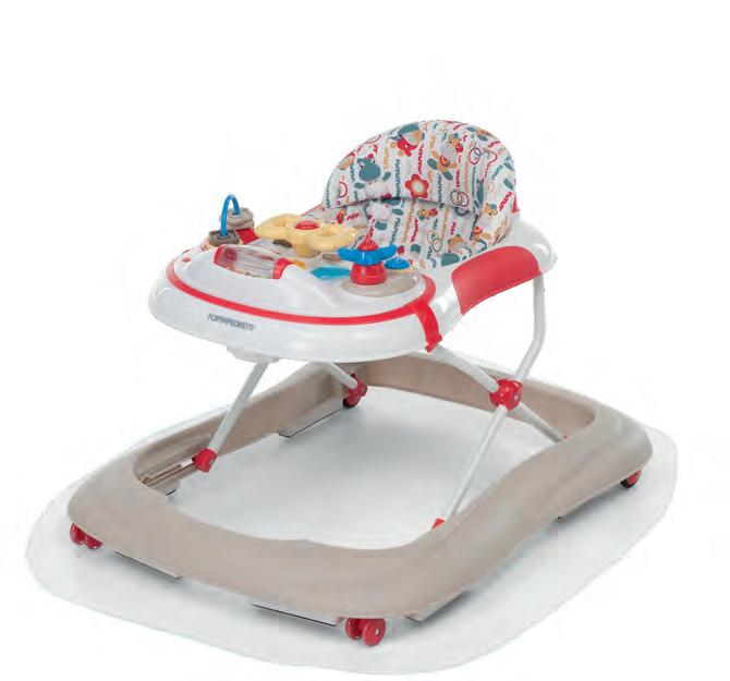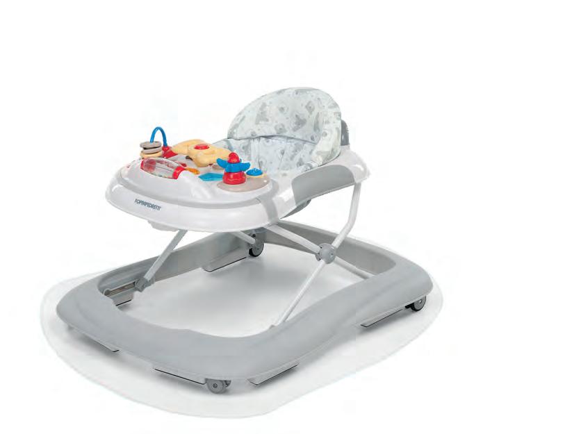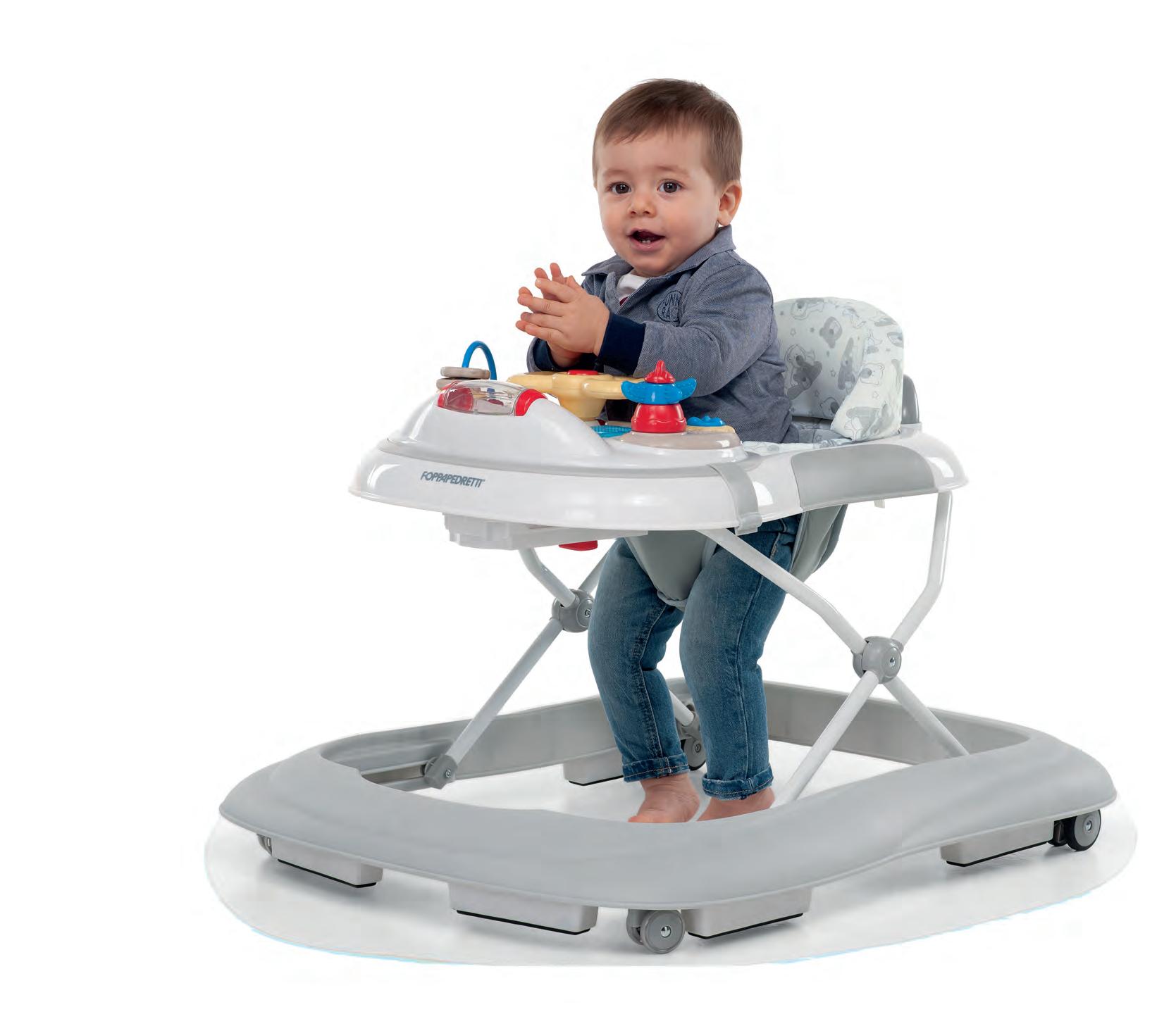 Playgiò è una postazione completa studiata per stimolare le attività di gioco, di apprendimento e dei primi passi. Oltre alla seduta ammortizzata e regolabile, è presente un dispositivo di sicurezza che lo blocca in prossimità di dislivelli. Il gioco musicale è amovibile e si utilizza anche sganciato dal girello. Consigliato dai 6 mesi.