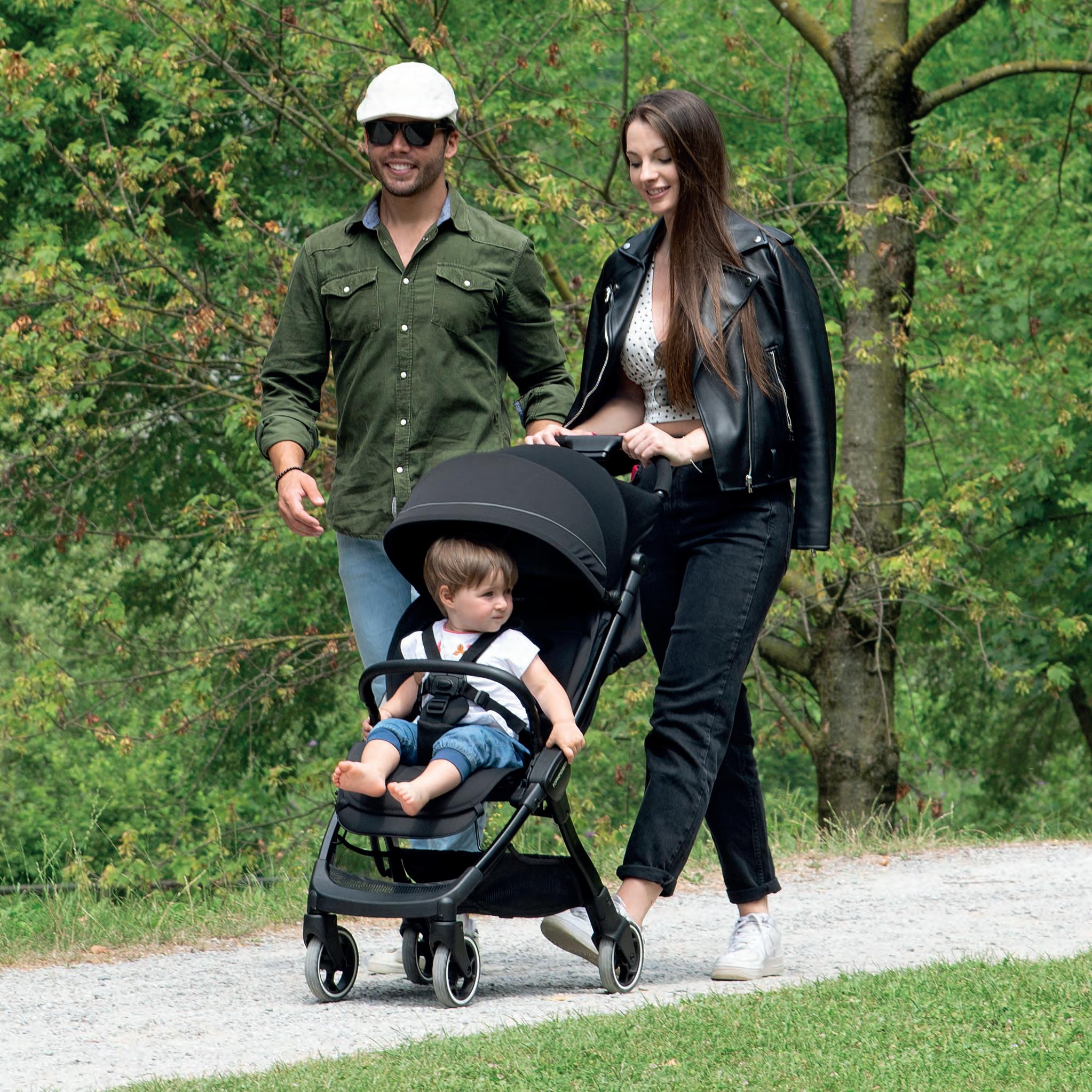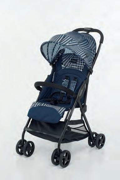 Passeggino con chiusura a libro dal design ultra compatto e modulabile. La larghezza di soli 51 cm consente di riporre il telaio anche negli spazi più piccoli, il maniglione telescopico e la capottina regolabili in altezza, lo rendono adatto ad ogni situazione.