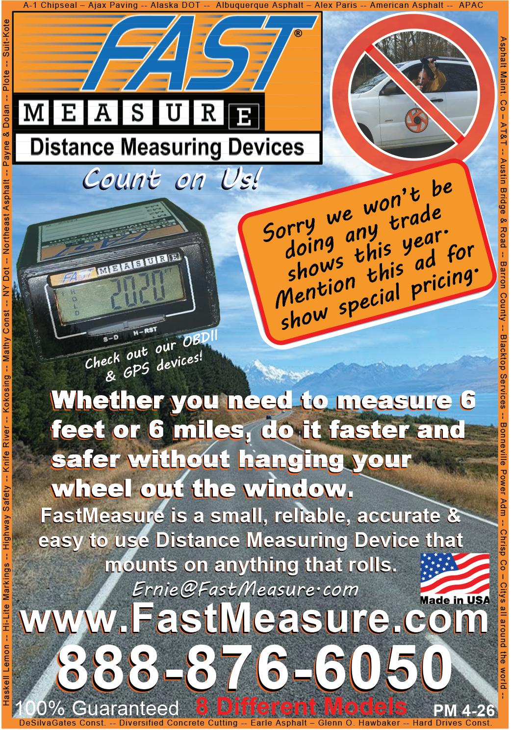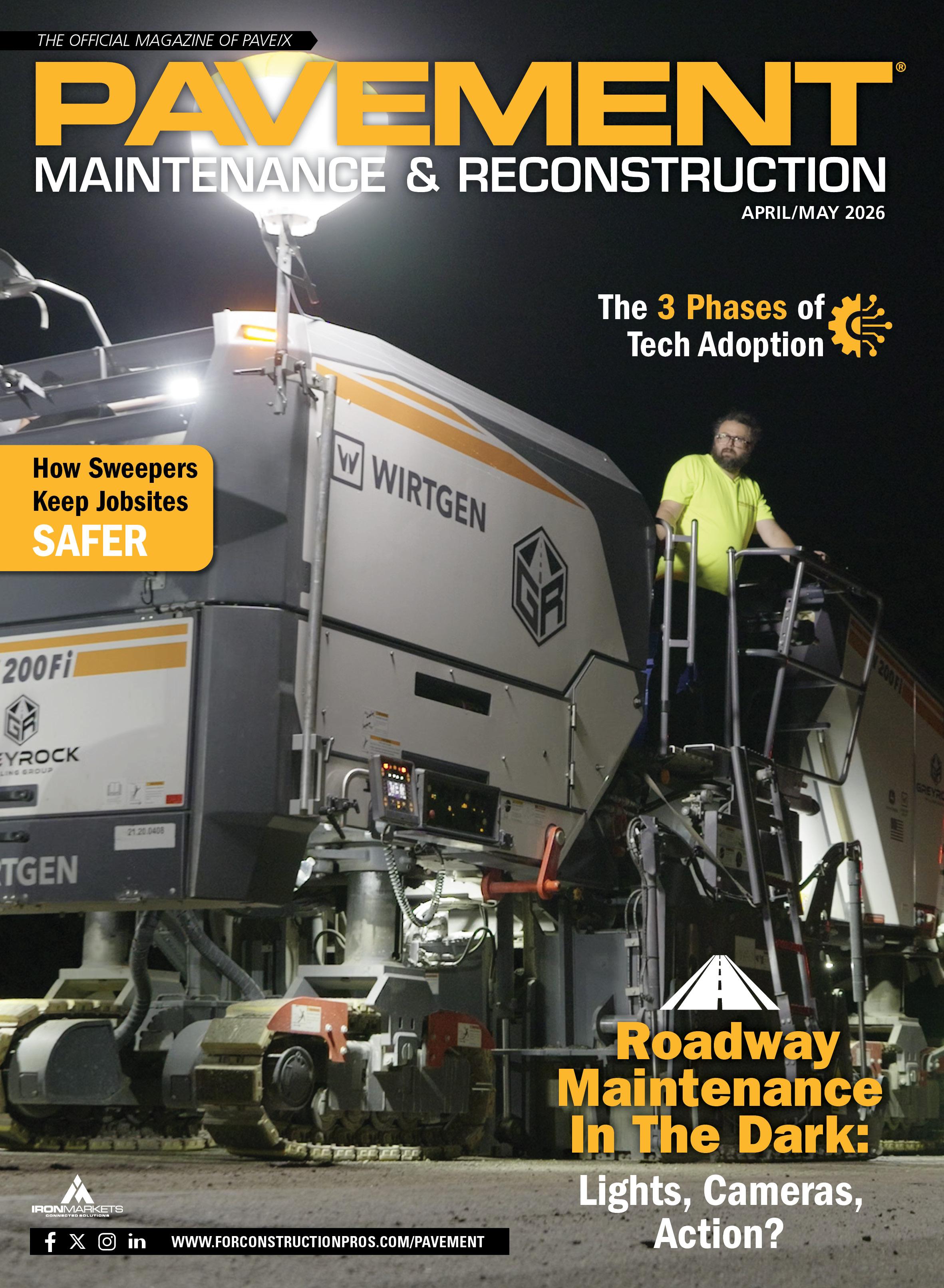 Subscription policy: Individual subscriptions are available without charge in the U.S. only to pavement maintenance contractors, producers and government employees involved in paving or pavement maintenance; dealers, and distributors of pavement maintenance equipment or materials; and others with similar business activities. Complete the subscription form at www.forconstructionpros.com or use your company letterhead giving all the information requested. Publisher reserves the right to reject nonqualified subscribers. One year subscriptions for nonqualified individuals: $35.00 U.S.A., $60.00 Canada and Mexico, and $85.00 all other countries (payable in U.S. funds, drawn on U.S. bank). Single copies available (prepaid only) $10.00 each (U.S., Canada & Mexico), $15.00 each (International). Pavement Maintenance & Reconstruction (ISSN 1098-5875), is published eight times per year: January, February, March, April/May, June/July, August/September, October/ November, December by IRONMARKETS, 201 N. Main St. Ste 350, Fort Atkinson, WI 53538. Periodicals postage paid at Fort Atkinson, WI and additional entry offices.