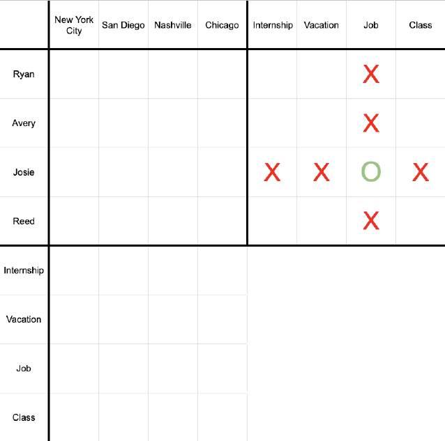 Instructions: Your friends Ryan, Avery, Josie and Reed told you all about their summer break plans, but now you can’t remember who was doing what. All that you remember are the details from the clues below.