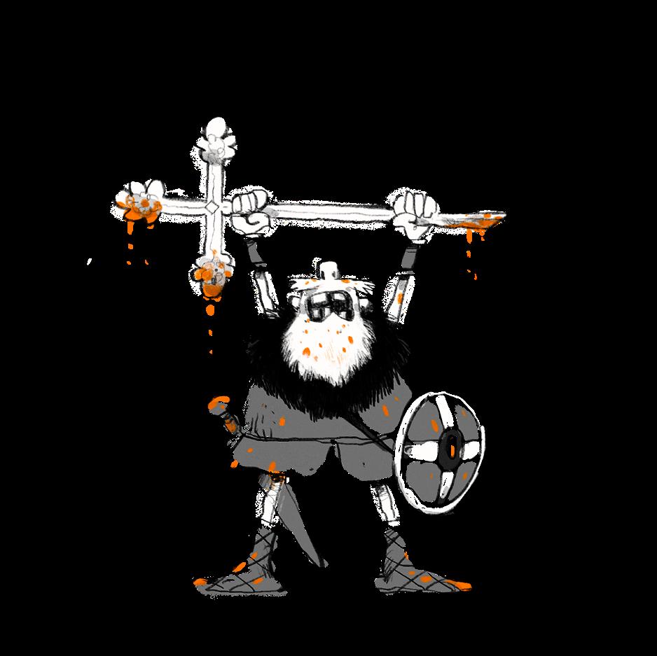 Foran klosteret sto en viking og reiv i stykker den dyrebare bibelen som en munk hadde jobba med i ti år. Sidene kasta han fra seg. Det var kun forsida med gullinnfatning og diamanter og juveler han ville ha. En annen viking sto fornøyd og kjente på vekta av sølvkorset som hadde hengt over alteret. Han prøvde å gnikke vekk munkeblod fra det med ermet.