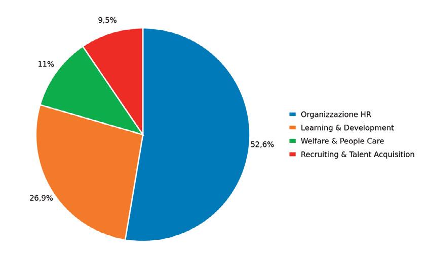 All'interno dell'area HR, la partecipazione si concentra soprattutto su Organizzazione HR (52,7%) e Learning & Development (26,9%), seguite da Welfare & People Care (11%) e Recruiting & Talent Acquisition (9,5%).