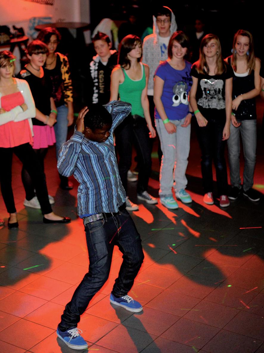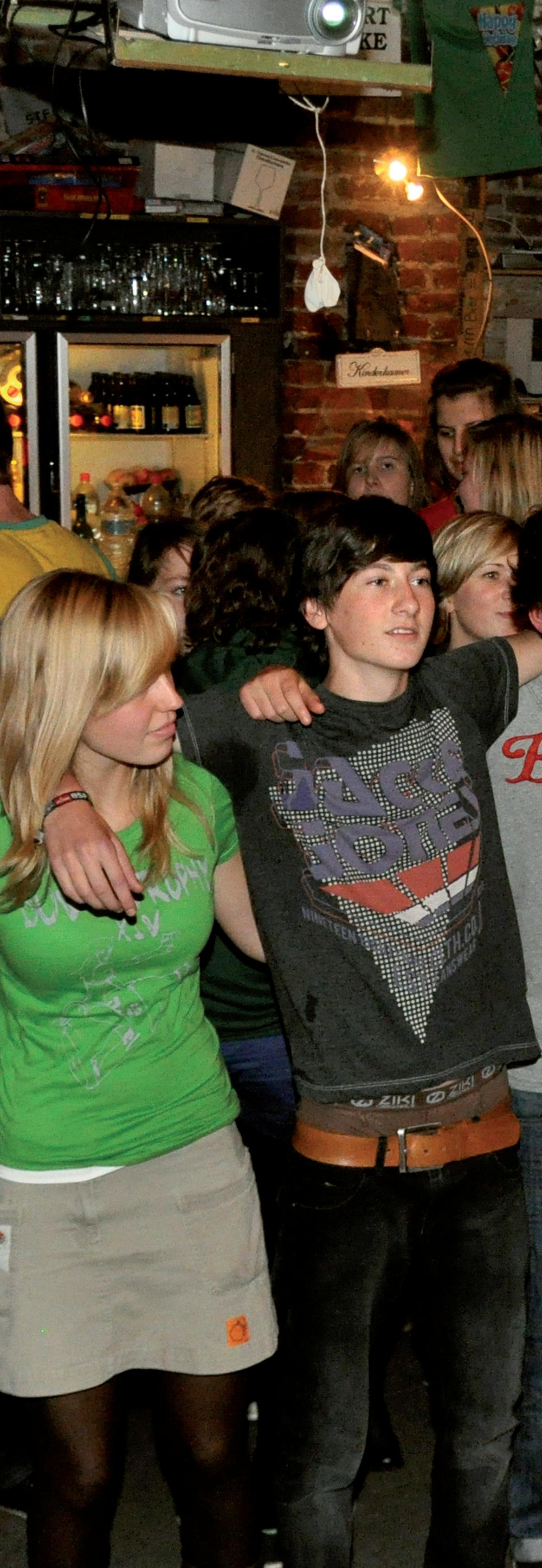 Evenveel volk staat rond de deejayhoek en zoekt wat cd’s uit om het weekend op feestelijke wijze in te zetten. In de zetels in de hoek trekt een groep meisjes zich daar niks van aan . Voor hen is de vrijdagavond in het jeugdhuis hét moment om na te praten over de voorbije schoolweek.”