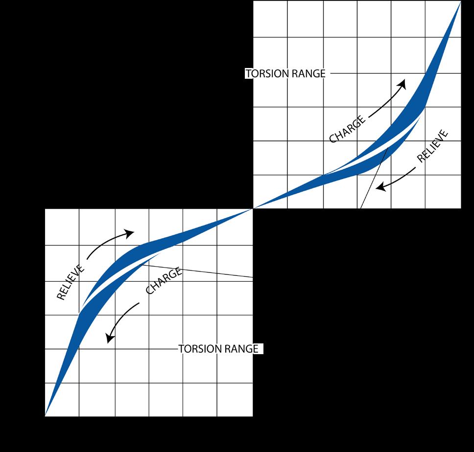 Acting as a torsional spring device, the system allows for a range of movement of 60° in either direction from rest point. The level of resistance increases exponentially throughout the range of movement (torque) away from rest (charge). As the unit returns to rest position (relieve) the energy loss per oscillation produces a resultant damping effect.