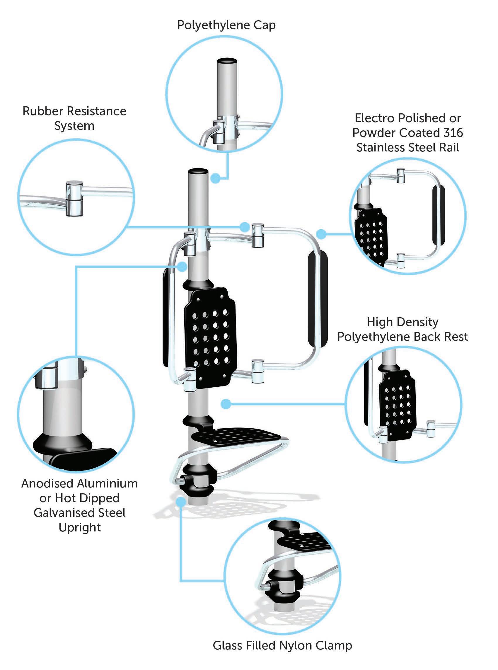 ParkFit is manufactured from the highest quality materials including marine grade 316 electro polished or powder coated stainless steel, hot dip galvanised steel, anodised aluminium and injection moulded glass-filled nylon. The use of these materials provides the highest level of corrosive protection available making ParkFit the perfect option for coastal areas.