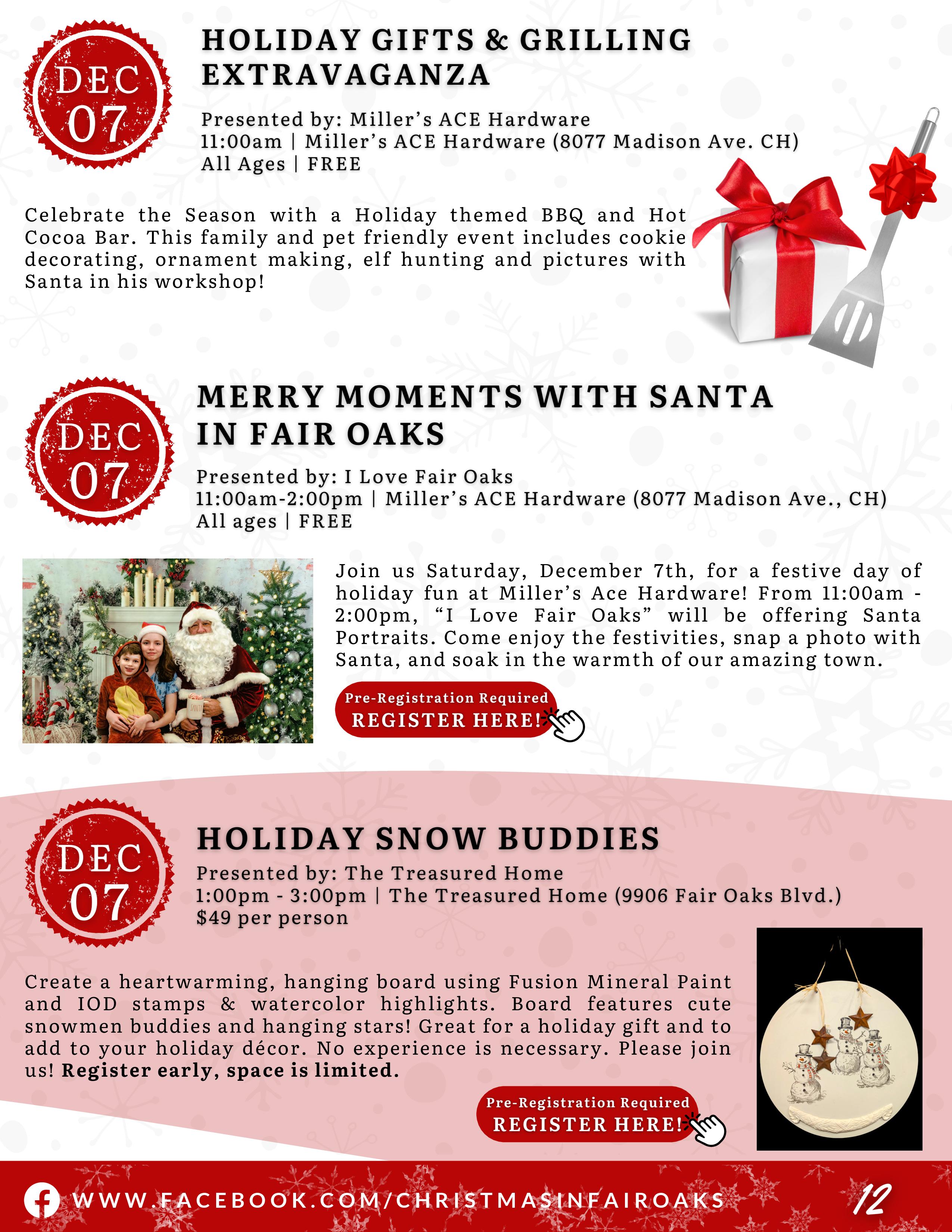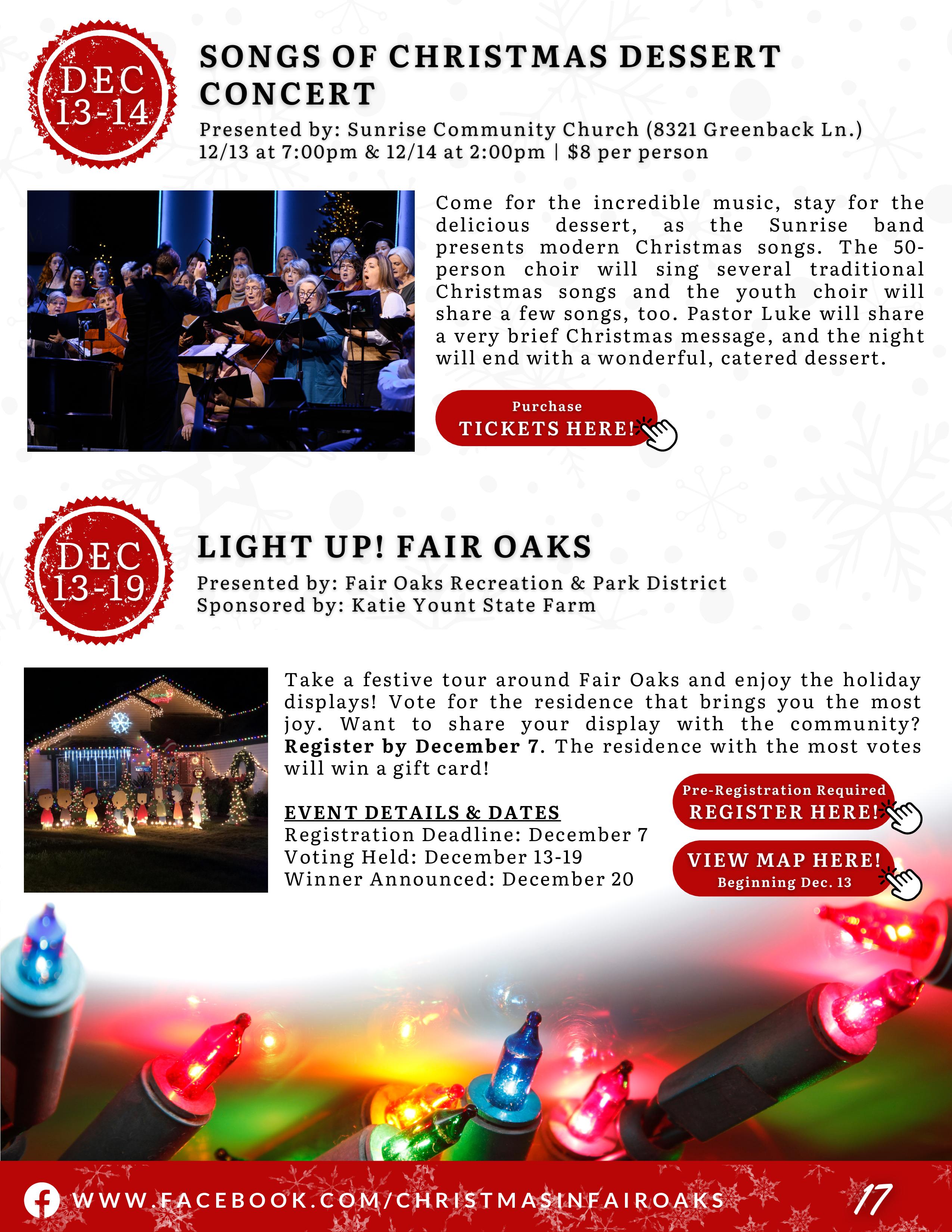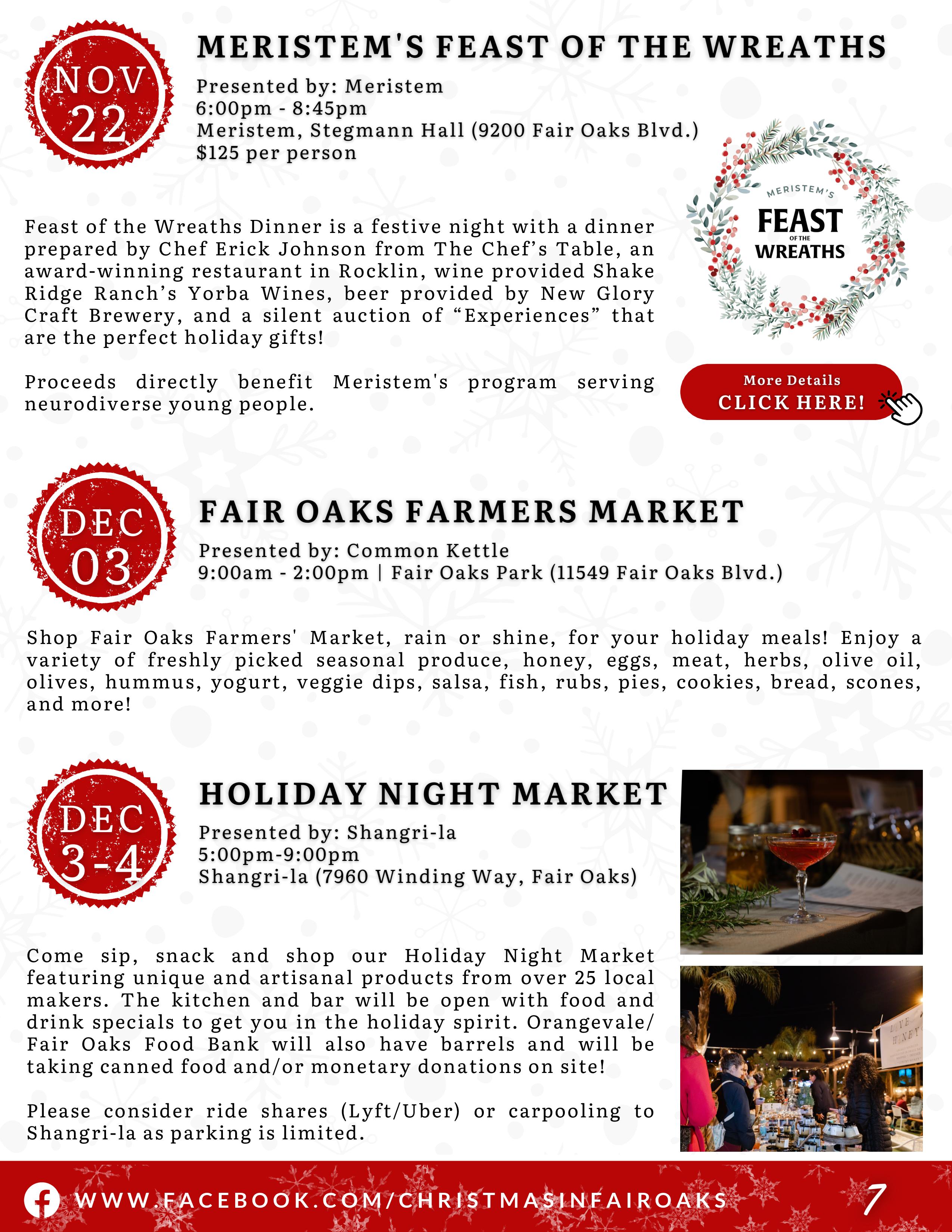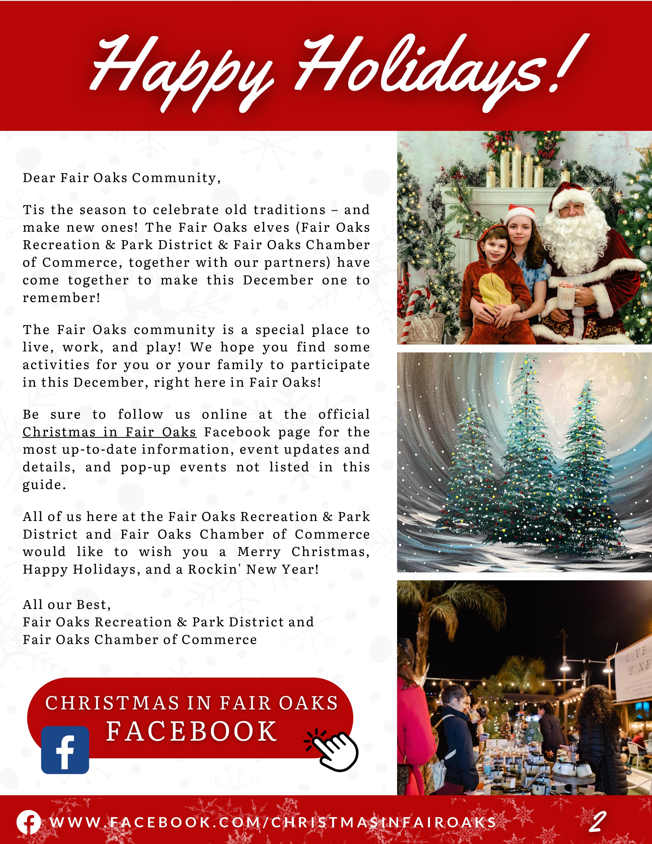 Be sure to follow us online at the official Christmas in Fair Oaks Facebook page for the most up-to-date information, event updates and details, and pop-up events not listed in this guide.