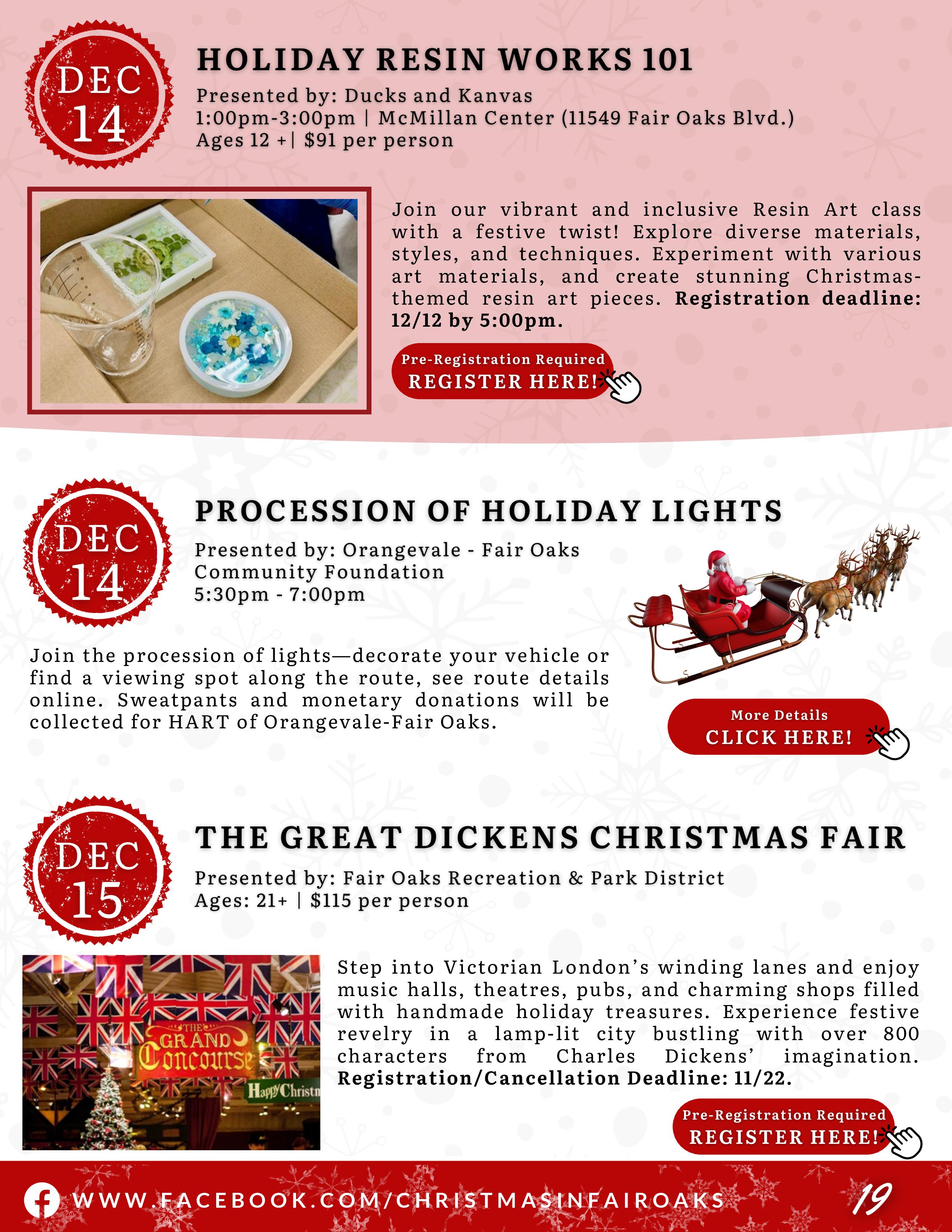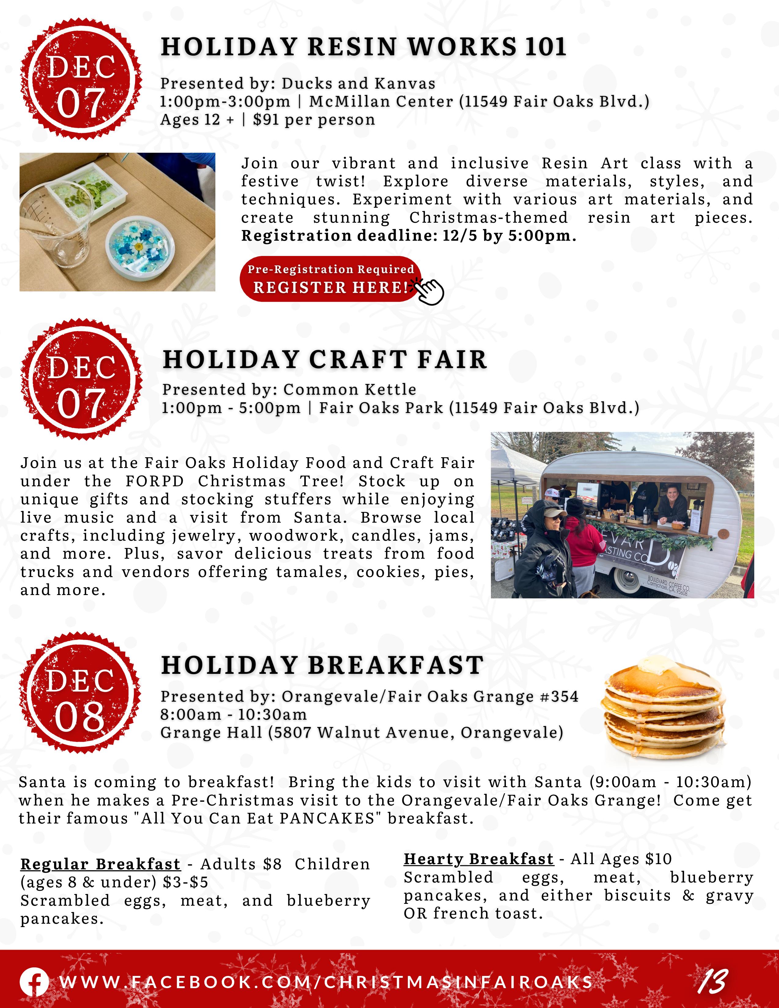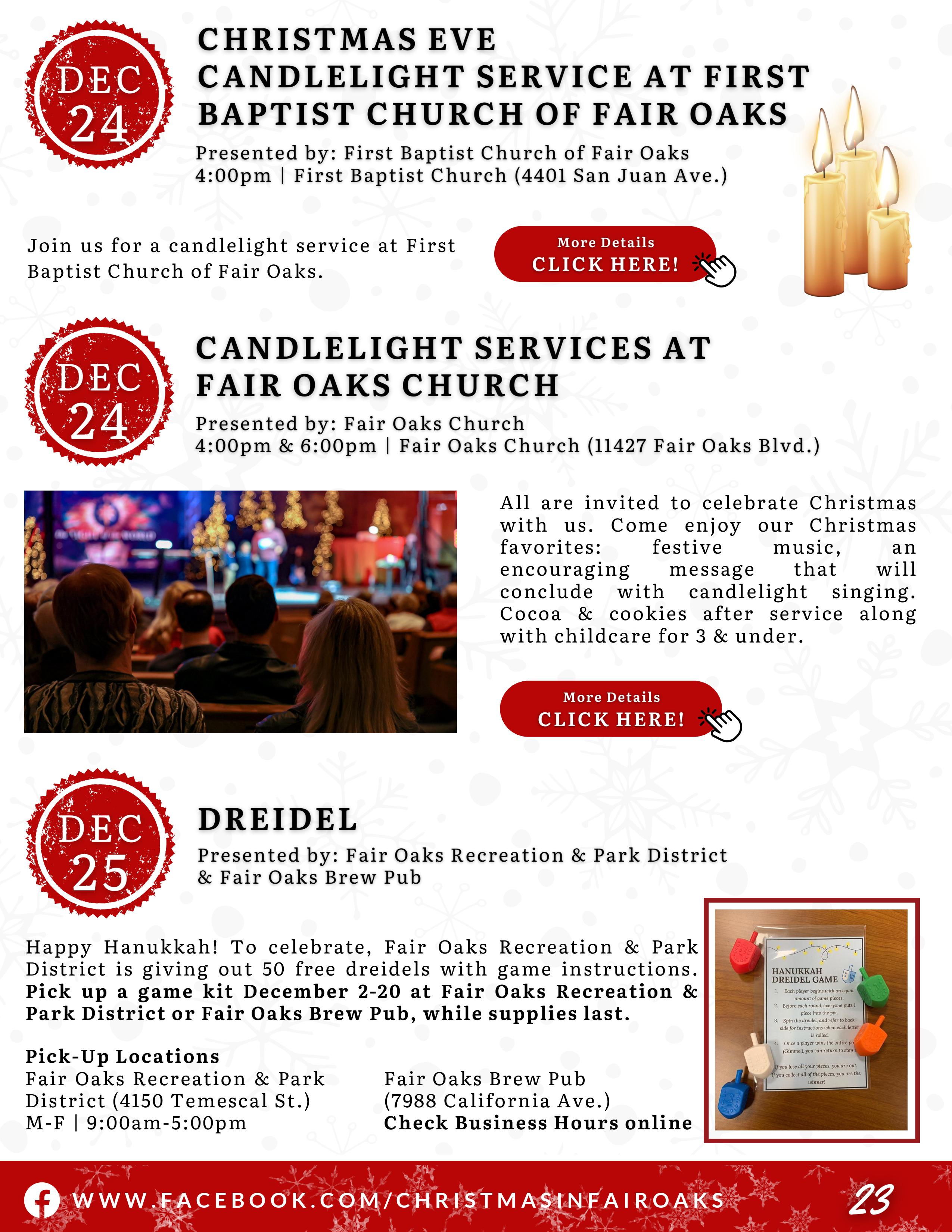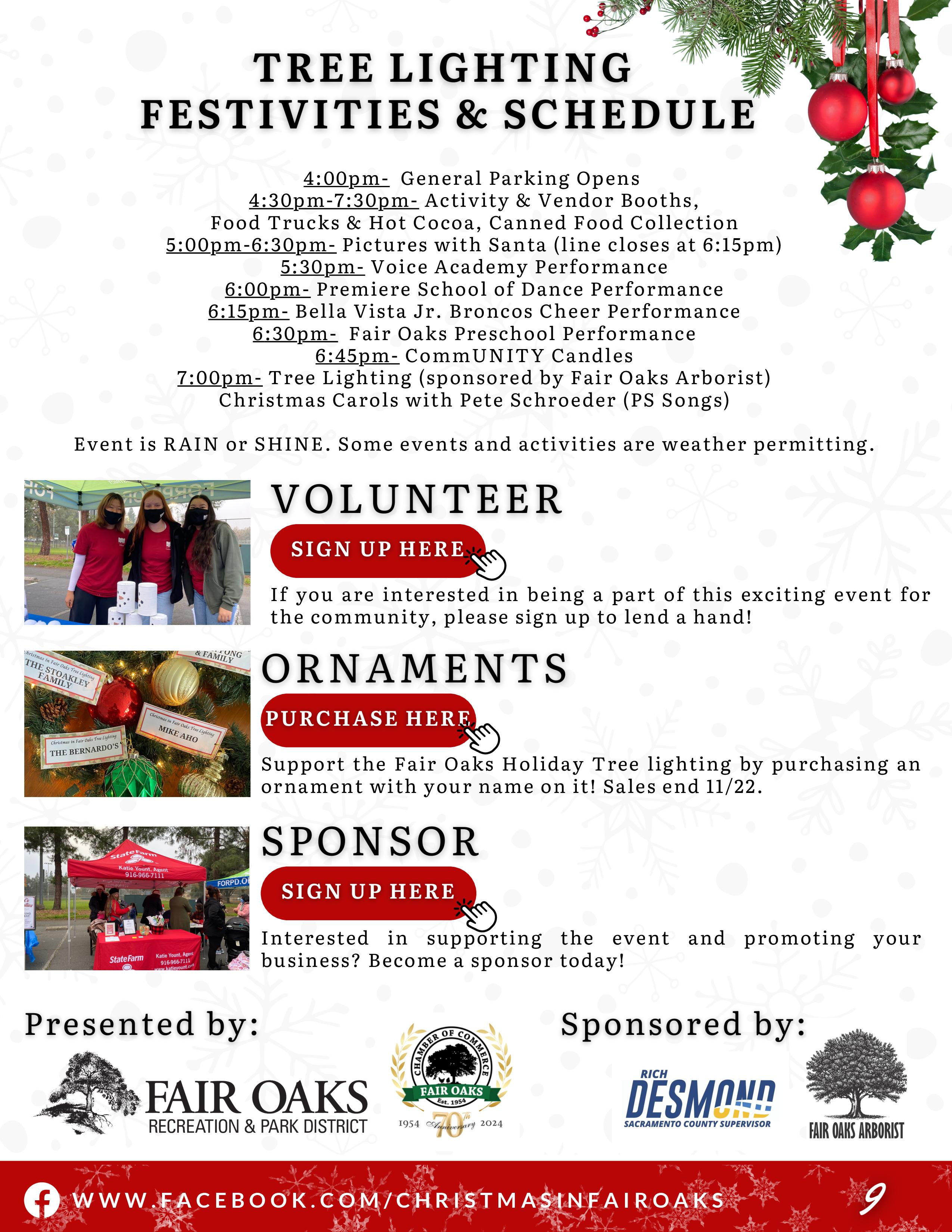 Be sure to follow us online at the official Christmas in Fair Oaks Facebook page for the most up-to-date information, event updates and details, and pop-up events not listed in this guide.