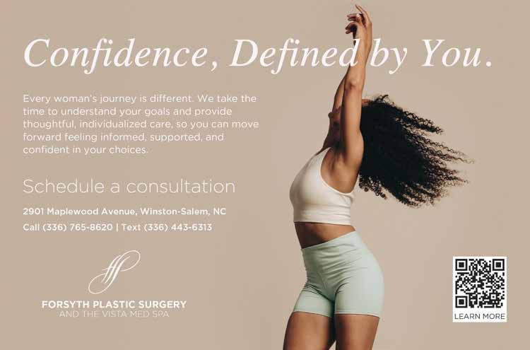 Forsyth Woman Disclaimer: Please note that the inclusion of stories and articles in Forsyth Woman magazine does not imply endorsement of products or people. The views of the authors are presented for information and entertainment only, and may not necessarily reflect the views of Forsyth Woman. Specifically, Forsyth Woman in no way endorses any claim associated with health and/or well being with respect to any particular person. We disclaim all warranties, express or implied, including, but not limited to, implied warranties of merchantability and fitness for a particular purpose. We will not be held responsible or liable, directly or indirectly, for any loss or damage that is caused or alleged to have been caused in connection with the use of, or reliance on, any content in this magazine. Forsyth Woman reserves the right to deny any advertisement or listing that does not meet Forsyth Woman standards. Submissions are welcome but unsolicited materials are not guaranteed to be returned. Forsyth Woman assumes no responsibility for information, products, services or statements made by advertisers or editorial contributors. All rights reserved. Reproduction in whole or in part without written permission from the publisher is prohibited. ©2005 by Forsyth Woman, Inc.