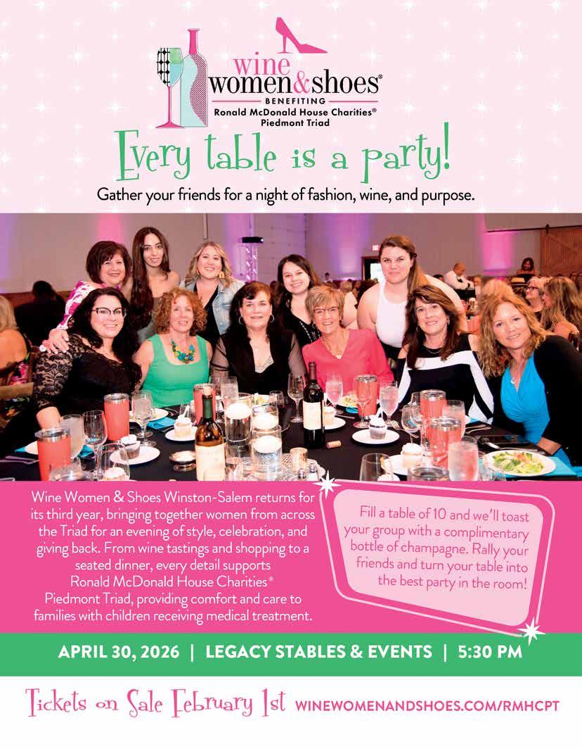 5:30pm, Legacy Stables & Events. Gather your friends for a night of fashion, wine and purpose where every table is a party! Fill a table of 10, and we’ll toast your group with a complimentary bottle of champagne. Rally your friends, and turn your table into the best party in the room. This event returns for the third year, bringing together women from across the Triad for an evening of style, celebration and giving back. From wine tastings and shopping to a seated dinner, every detail supports Ronald McDonald House Charities Piedmont Triad. Tickets on sale at winewomenandshoes.com/rmhcpt.
