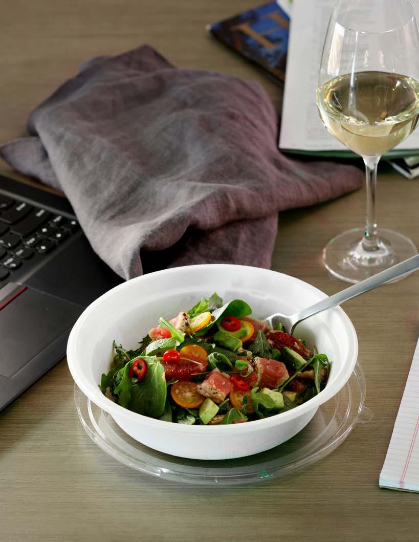 Eco-friendly components made with sugarcane are biodegradable, microwave, and refrigerator friendly. Clear lids close securely and allow guests to see selections for easy grab-and-go.