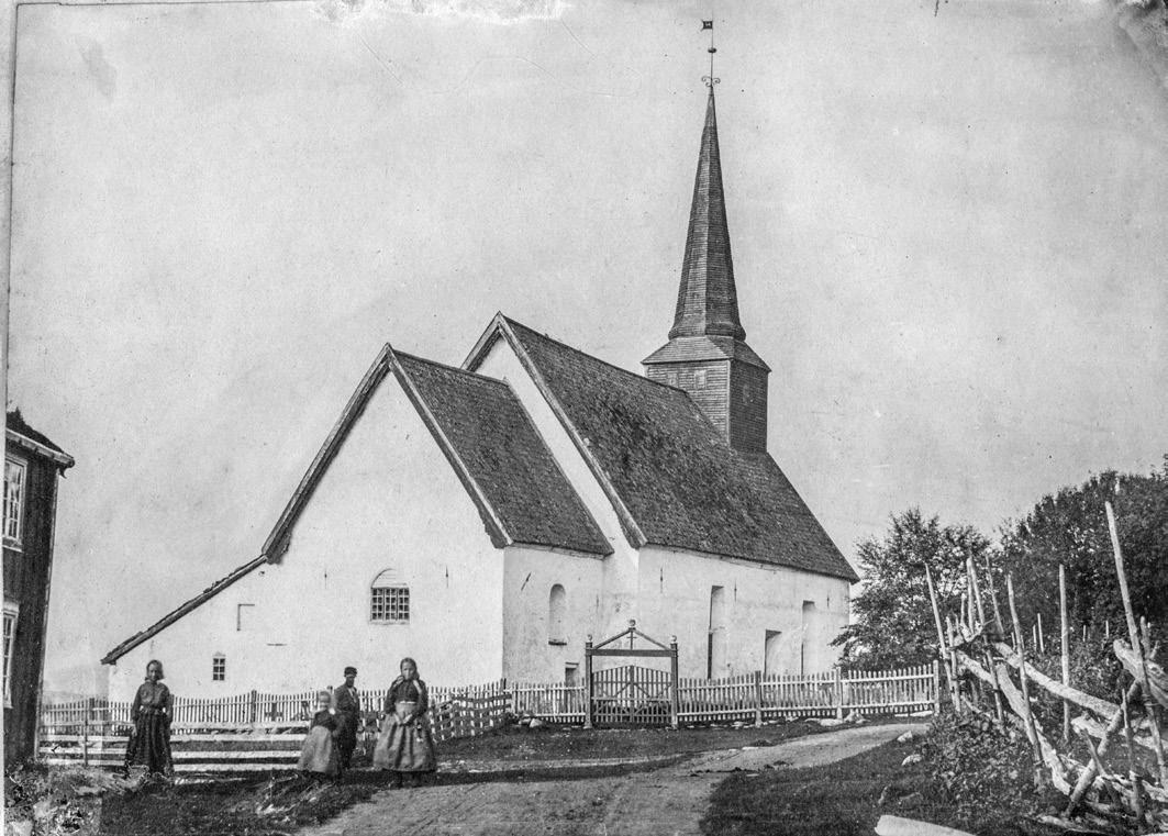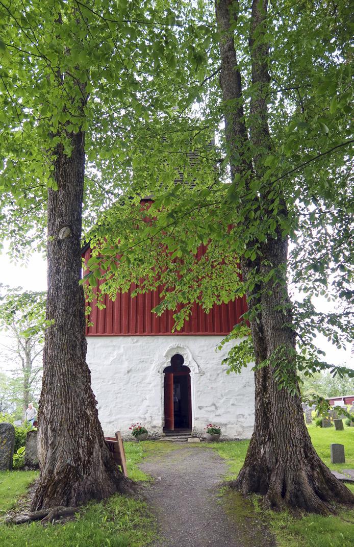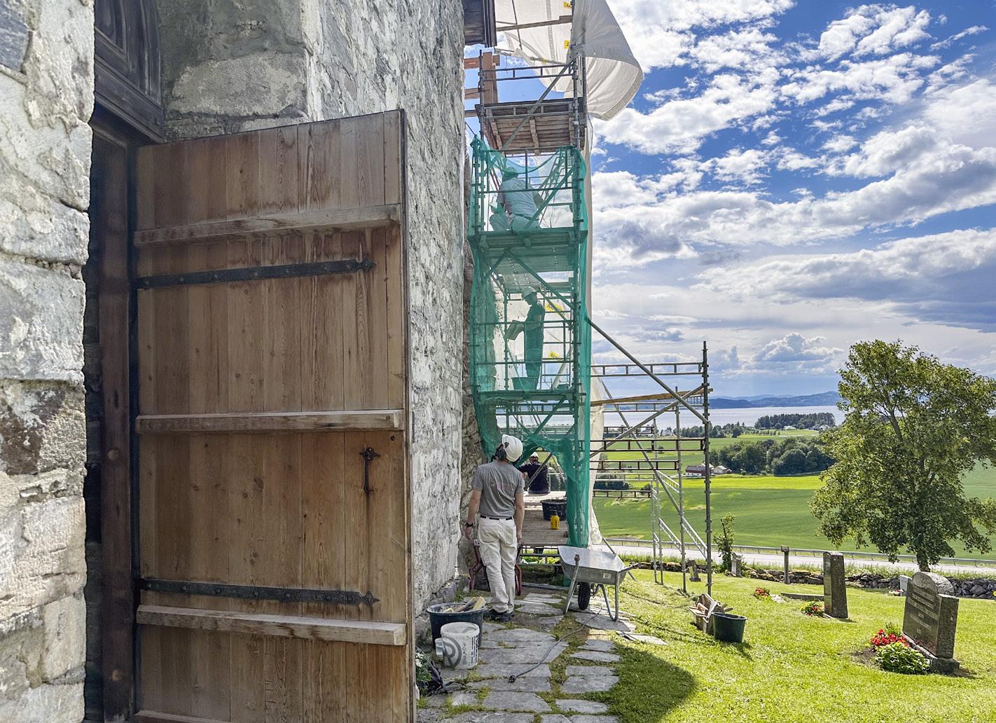 Kirkebevaringsfondet skal gå til istandsetting og restaurering av både eksteriør og interiør. Bildene viser fasaden til Hustad kirke og altertavlen i Sakshaug gamle kirke, begge på Inderøya i Trøndelag. Merete Winness fra Fortidsminneforeningen og geoarkeolog Per Storemyr fra Fabrica Kulturminnetjenester AS undersøker tilstanden på Moster gamle kirke i Vestland under en befaring tidligere i sommer.