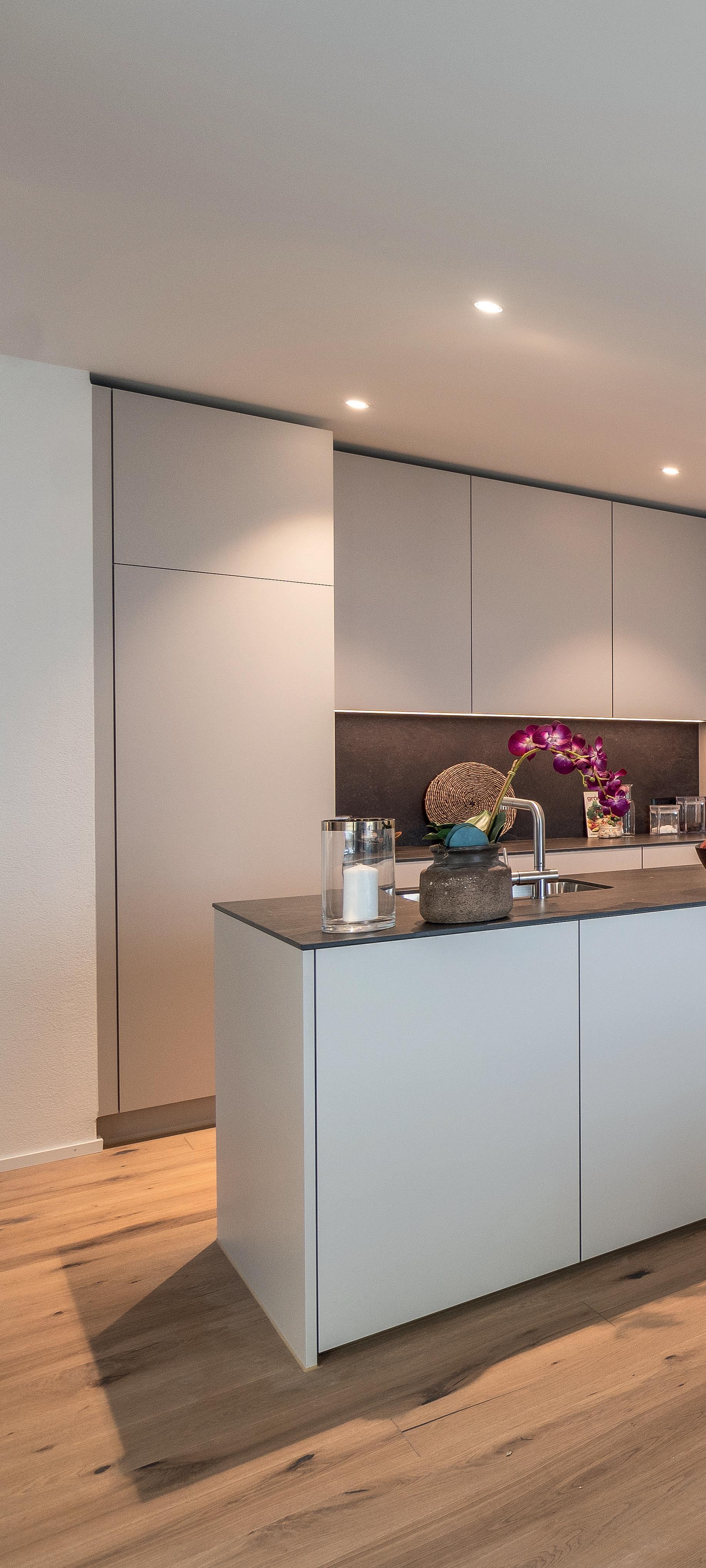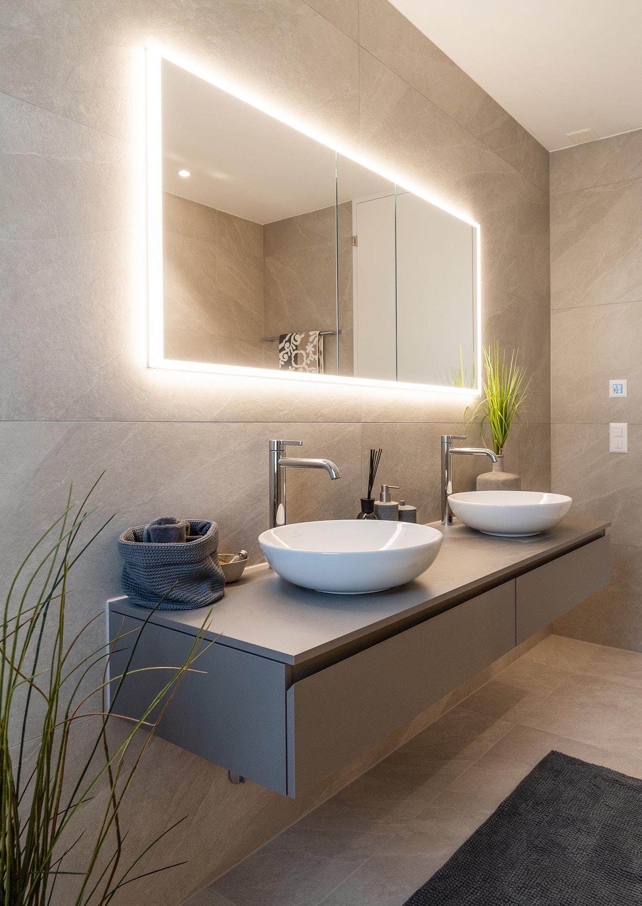 Grosszügige Duschen und Badewannen, Glastrennwände, Waschtische, Unterbaumöbel, Spiegelschränke und Wandklosett machen die Nassräume komplett.