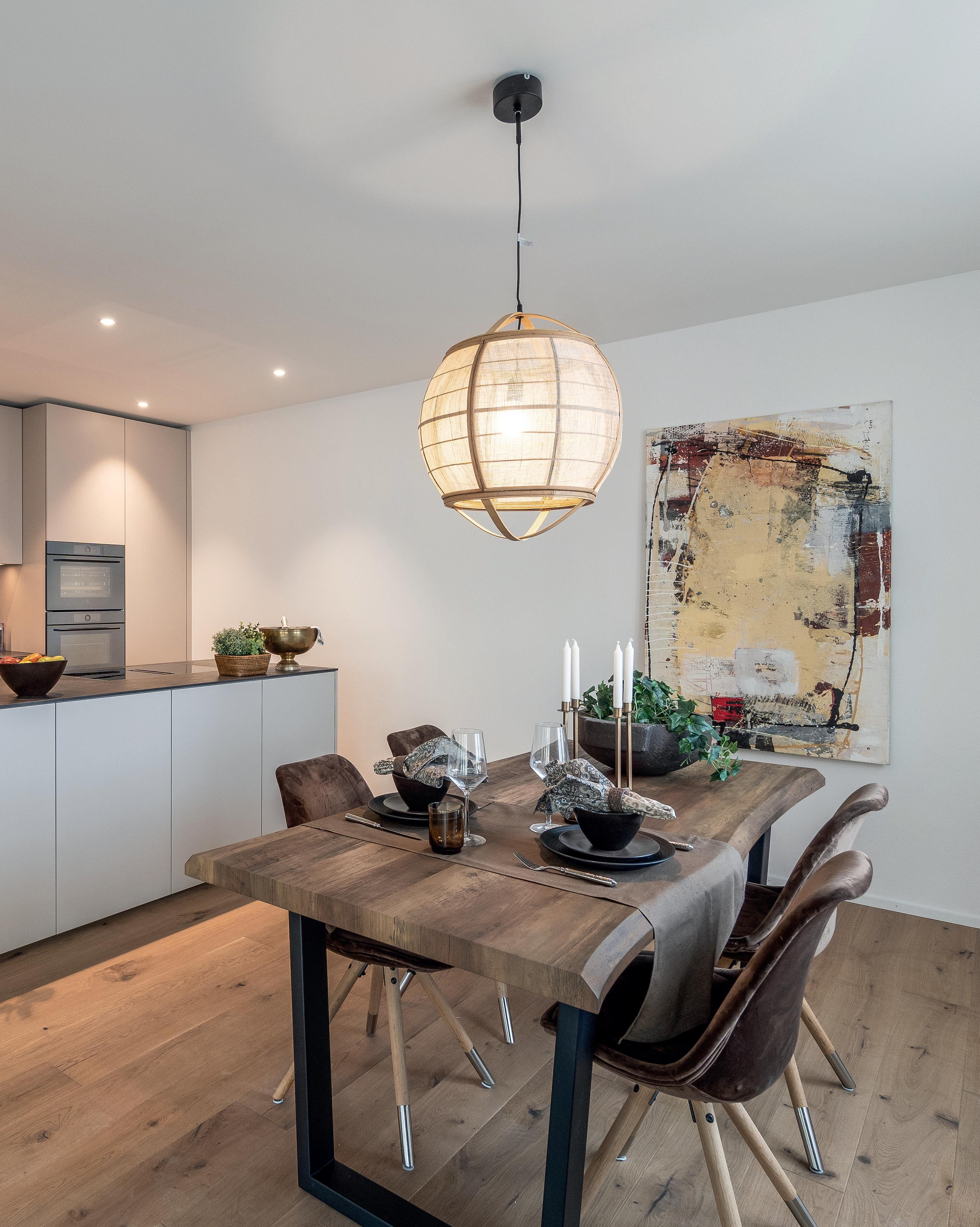 In sämtlichen Wohnräumen ist ein Parkett verlegt und in den Reduits keramische Platten. Die Wände sind in hellem Abrieb gehalten, die Decken in Weissputz. Die Nassräume sind mit pflegeleichten keramischen Boden- und teilweise mit Wandplatten versehen.