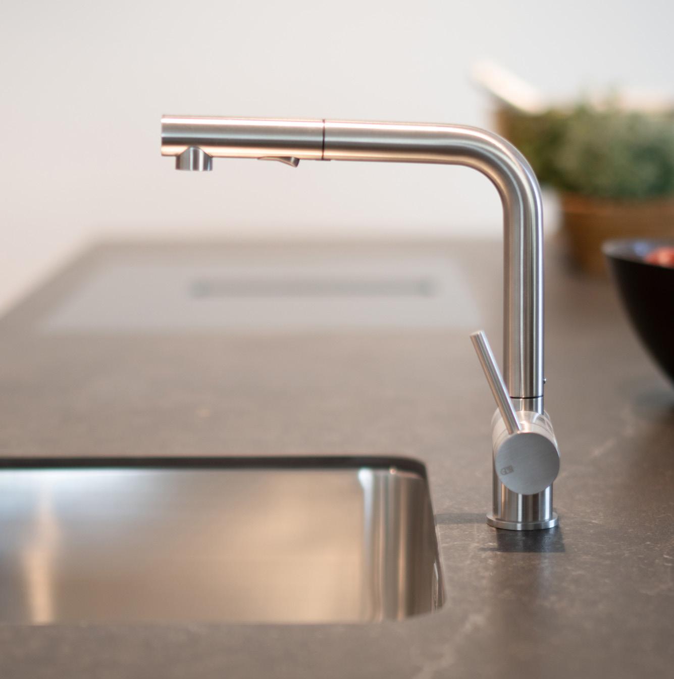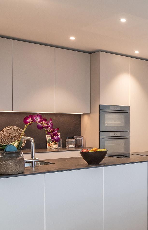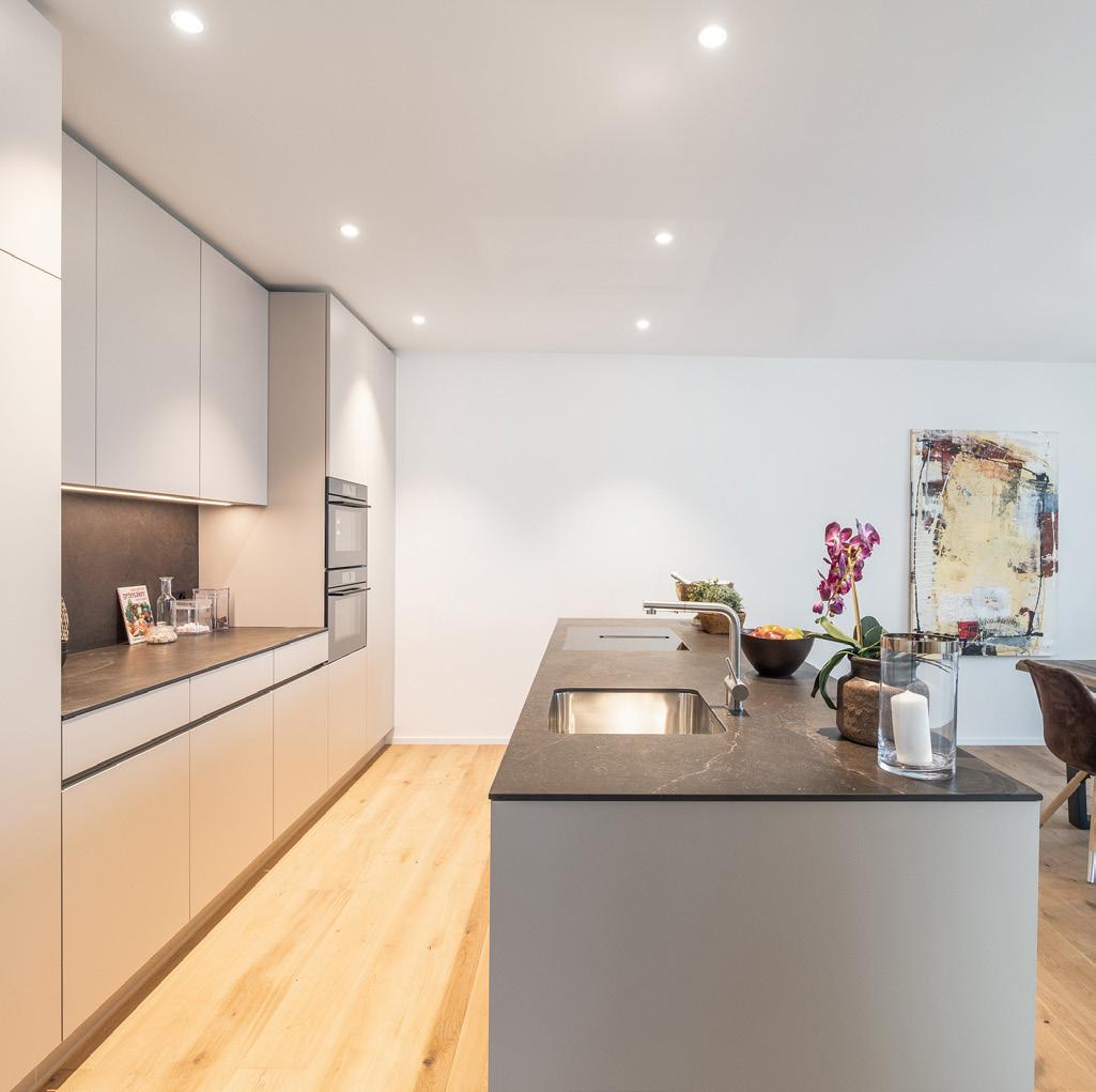Die Küche bietet zahlreiche Ober- und Unterschränke, Arbeitsflächen und Rückwände aus Granit, hochwertige Geräte wie Steamer, Backofen, Geschirrspüler, Induktionskochfeld mit Muldenlüfter, Edelstahlbecken sowie Deckeneinbauspots und LED Beleuchtung unter den Hängeschränken.