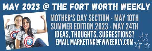 1.) Enjoy a decadent chef-prepared meal with all your brunch favorites at the annual Mother’s Day Brunch Sunday at the Omni Hotel (1300 Houston St, Second Level, Fort Worth, 817-535-6664). There will be live music and a special treat for the mothers in attendance. Seating times are available every 45 minutes 11am-3pm. The cost is $78 for adults, $40 for children ages 6-12, and complimentary for children ages 5 and under. See the menu selections at OmniHotels.com/Hotels/Fort-Worth/Dining. For reservations, visit bit.ly/3GOPwyU.