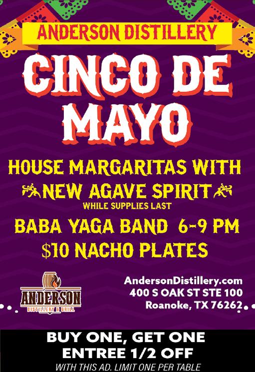 1.) Anderson Distillery & Grill (400 S Oak St, Ste 100, Roanoke, 817-203-0623) has a fiesta-filled Friday on the schedule. Enjoy housemade margaritas featuring Anderson’s new agave spirit, $10 nacho plates, and live music by the Baba Yaga Band from 6pm to 9pm.