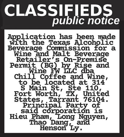 INFORMATION AVAILABLE ONLINE. When they become available, the executive director’s response to comments and the final decision on this application will be accessible through the Commission’s Web site at www.tceq.texas. gov/goto/cid. Once you have access to the CID using the above link, enter the permit number for this application which is provided at the top of this notice. This link to an electronic map of the site or facility’s general location is provided as a public courtesy and not part of the application or notice. For exact location, refer to application. https:// gisweb.tceq.texas.gov/LocationMapper/?marker=-97.053888,32.776944&level=13