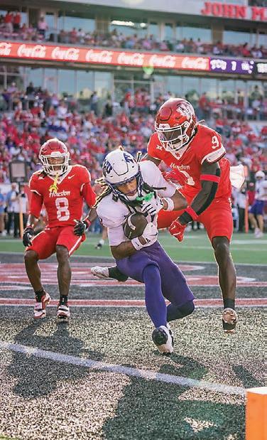 timely interception by Julius Simms (#31) in his own endzone proved to be pivotal in surviving a tight game where the difference was two missed field goals by the Cougars, including a manageable 38-yarder that would have tied the game with only seconds remaining. Jeremy Payne (#26) stepped up as the leading rusher, accumulating 103 yards on 18 carries, and probably would have been the better choice on the fourth-and-short that would have iced the game but instead gave way to a 74yard drive with less than two minutes remaining.