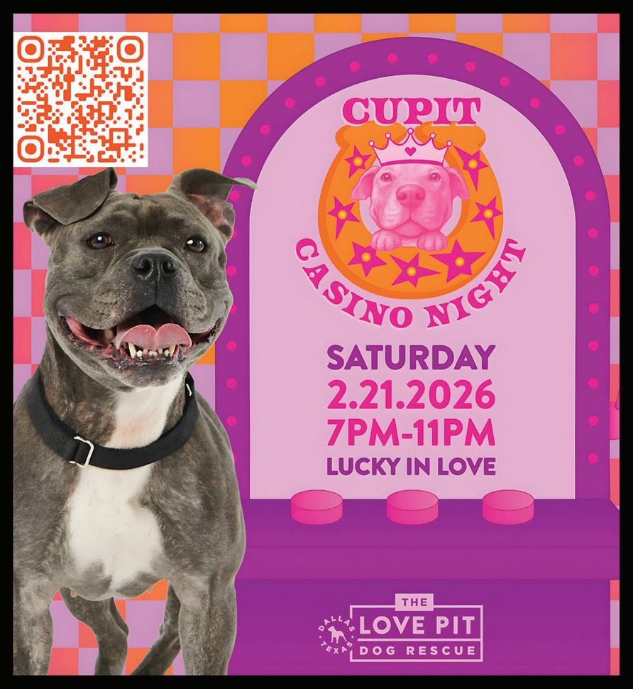 Lucky in Love “Cupit” (get it?) Casino Night is Saturday, February 21st on the levee at 1108 Quaker St in Dallas, benefitting The Love Pit who is on a mission to save bully breeds thru rescue, rehab, education, and advocacy. Learn more at: Facebook.com/TheLovePit