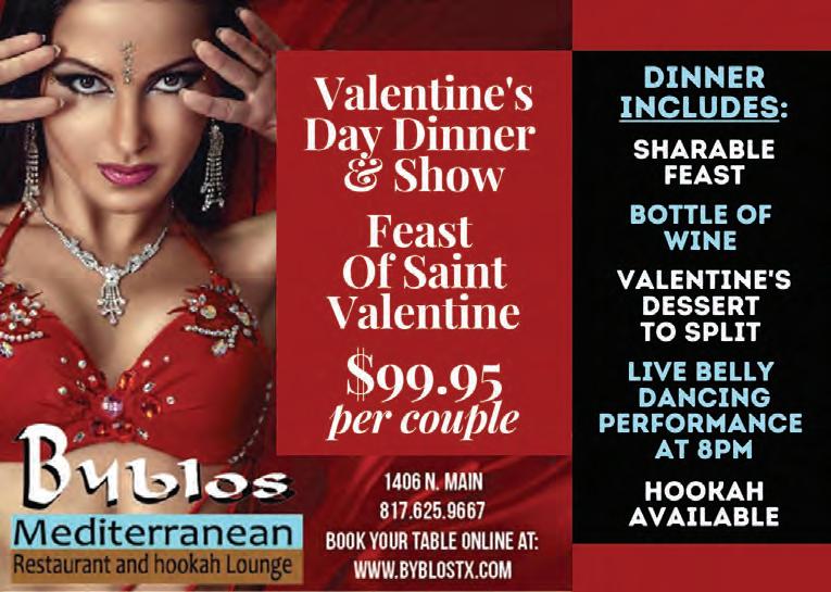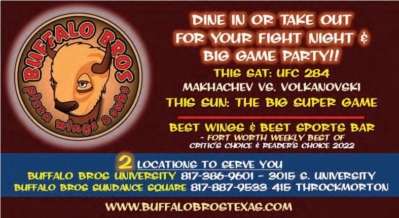 DISTRIBUTION Fort Worth Weekly is available free of charge in the Metroplex, limited to one copy per reader. Additional copies of Fort Worth Weekly may be purchased for $1.00 each, payable at the Fort Worth Weekly office in advance. Fort Worth Weekly may be distributed only by Fort Worth Weekly’s authorized independent contractors or Fort Worth Weekly’s authorized distributors. No person may, without prior written permission of Fort Worth Weekly, take more than one copy of any Fort Worth Weekly issue. If you’re interested in being a distribution point for Fort Worth Weekly, please contact Will Turner at 817-321-9788. COPYRIGHT The entire contents of Fort Worth Weekly are Copyright 2022 by Ft. Worth Weekly, LP. No portion may be reproduced in whole or in part by any means, including electronic retrieval systems, without the express written permission of the publisher. Please call the Fort Worth Weekly office for back-issue information. Fort Worth Weekly mailing address: 300 Bailey, Ste 205, Fort Worth TX 76107 Street address: 300 Bailey, Ste 205, Fort Worth TX 76107 For general information: 817-321-9700 For retail advertising: 817-321-9719 For classifieds: 817-987-7689 For national advertising: 817-243-2250 website: www.fwweekly.com email: question@fwweekly.com Volume 18 Nu mber 42 F ebruary 8-14, 2023