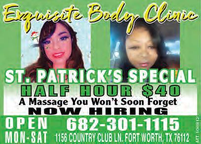 FORT WORTH WEEKLY MARCH 6-12, 2024 fwweekly.com 28 BYOB Free Delivery Limited Area & Minimum $20 3431 W 7th St • Fort Worth, TX 76107 817.332.3339 $10 Lunch Special M–F 11am–2pm Tuk Tuk Thai Thai Street Food Food to go & Catering Soothing Body Rubs and Reflexology Day Spa Come In Relax and Take Away Your Stress! Call For Appointment 682-252-8868 or 817-510-3262 CANDY and STAR All New From Out Of State! OPEN 7 DAYS A WEEK 10A- 8P COUPLES WELCOME!