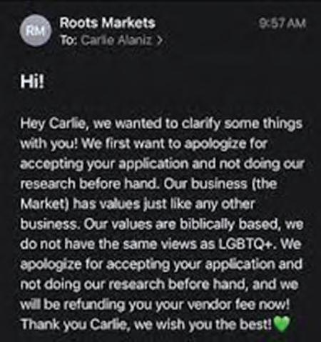Prompting the uproar was the early-June snubbing of an openly queer former Roots Markets vendor (“Square Roots,” June 7). Carlie Alaniz, owner of The Lucky Pot Co., recently went public about the private message she received from the markets’ co-owners, who welcome money from the queer community but refuse to allow anyone who isn’t cisgender and straight to sell their stuff at Roots.