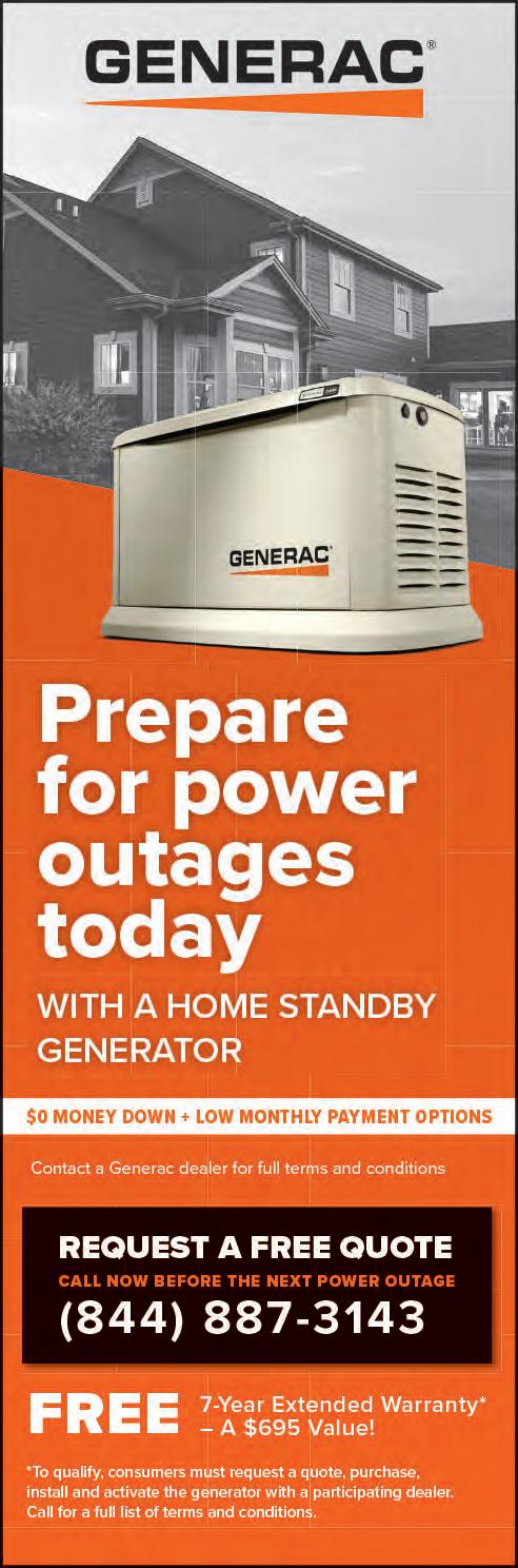 Prepare for power outages today with a home standby generator. No money down. Low monthly payment options. Call for a FREE quote before the next power outage. 1-844-887-3143