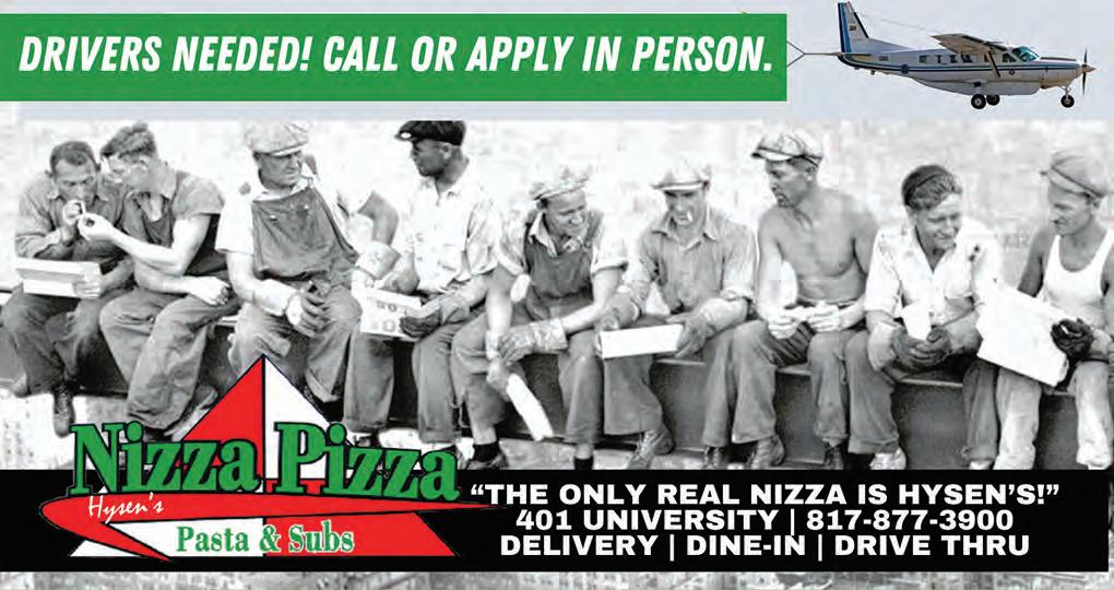 Nizza is seeking a counter person, delivery drivers, and wait staff. Apply in person at 401 University Drive, FWTX, 817-877-3900. (Open Sun-Thu 11am-10pm and Fri-Sat 10:30am-11pm.) HysensNizzaPizza.com