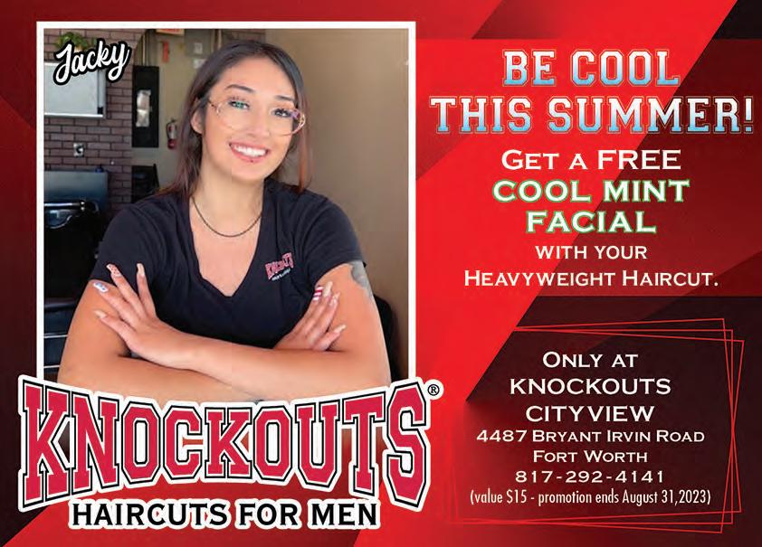 FORT WORTH WEEKLY JULY 19-25, 2023 fwweekly.com 6 SCAN TO LEARN MORE MEDIA SPONSOR unitedwaytarrant.org/BeatTheHeat TONED MUSCLEMEN TRINITY METROlove love Get pumped! Trinity Metro TEXRail lets you travel between Downtown Fort Worth, North Richland Hills, Grapevine and DFW Airport with no tra c –and no sweat! Find your new favorite ride now at RIDETRINITYMETRO.org/TEXRAIL. Bus | TRE | ZIPZONE TEXRail
