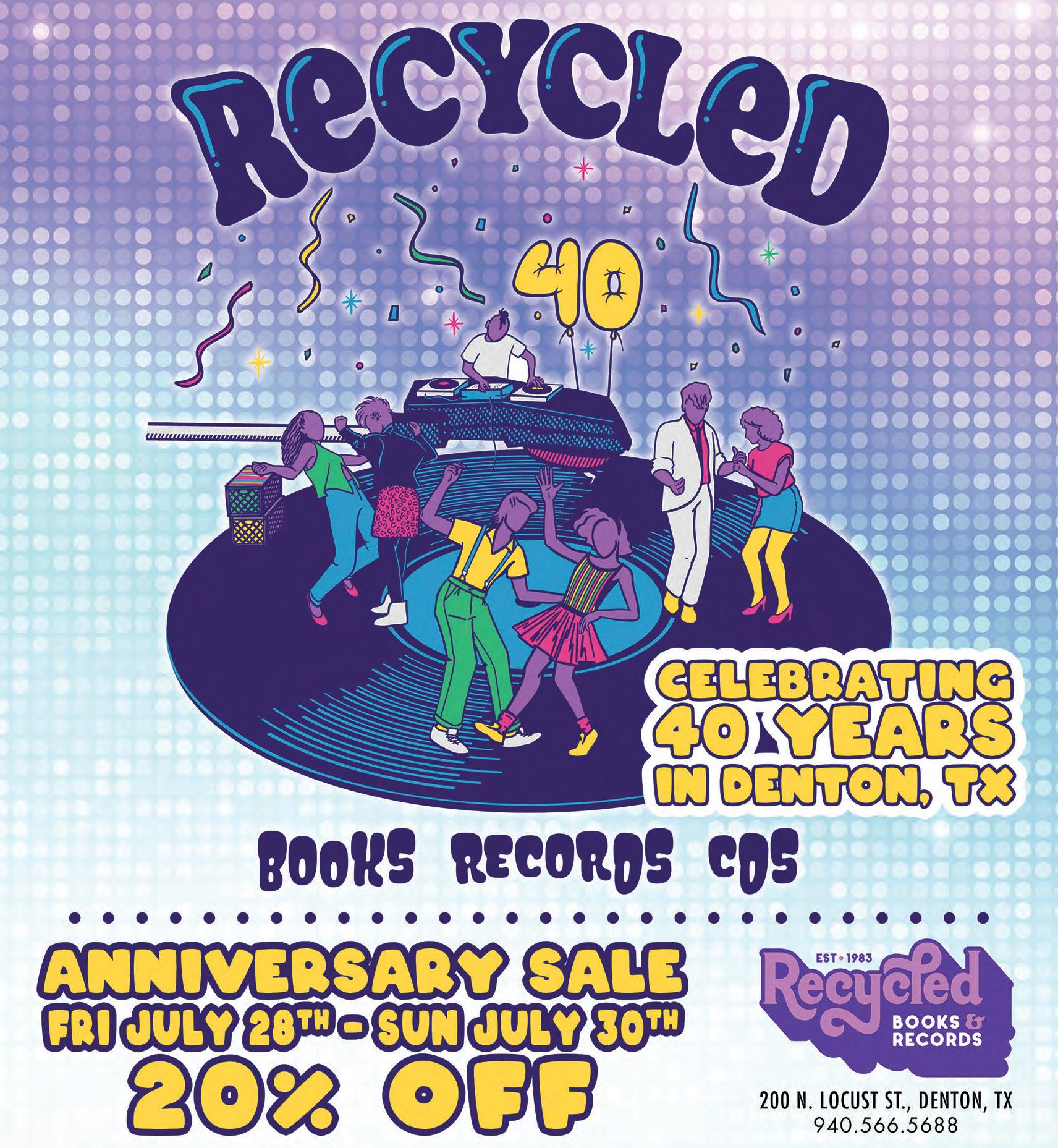 RECYCLED BOOKS & RECORDS is celebrating 40 years in Denton TX. Anniversary Sale 7/28-7/30