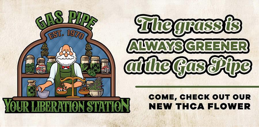 The Gas Pipe, The GAS PIPE, THE GAS PIPE, your Peace Love & Smoke Headquarters since 4/20/1970! SCORE a FREE GIFT on YOUR Birthday, FREE Scale Tuning and Lighter Refills on GAS PIPE goods, FREE Layaway, and all the safe, helpful service you expect from a 51 Years Young Joint. Plus, SCORE A FREE CBD HOLIDAZE GIFT With-A-Buy thru 12/31! Be Safe, Party Clean, Keep On Truckin’. More at thegaspipe.net