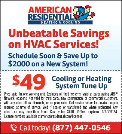 American Residential Heating & Cooling. As temps outside start to climb, the season for savings is now. $49 cooling or heating system tune up. Save up to $2000 on a new heating and cooling system (restrictions apply.) FREE estimates. Many payment options available. Licensed and insured professionals. Call today. 1-877-447-0546