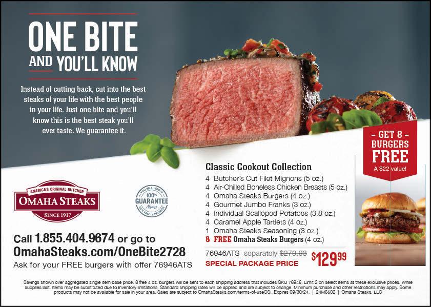 Send 100% guaranteed, delivered-to-the-door Omaha Steaks! This package comes with 8 FREE Burgers! Call or visit online and mention code 76946ATS. Order The Classic Cookout Collection! ONLY $129.99. (mb) OmahaSteaks.com/OneBite2728 1-855-404-9674