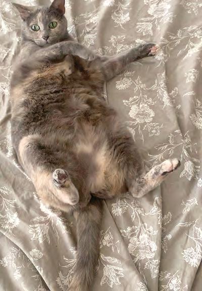 Gentle giant Finnegan showed up in proofreader Emmy Smith’s backyard one summer day skinny, dehydrated, and begging to be picked up. Now a robust (the vet’s term) 19 pounds, Finn loves chin scritches, greeting visitors at the front door, and playing with baby brother Whitman Wilde, a mischievous orange fuzzball who gets absolutely anything he wants because, well, look at him. Together, the boys share newcomer Charlotte, who loves playing with her beloved pickle and stealing her new brothers’ food.