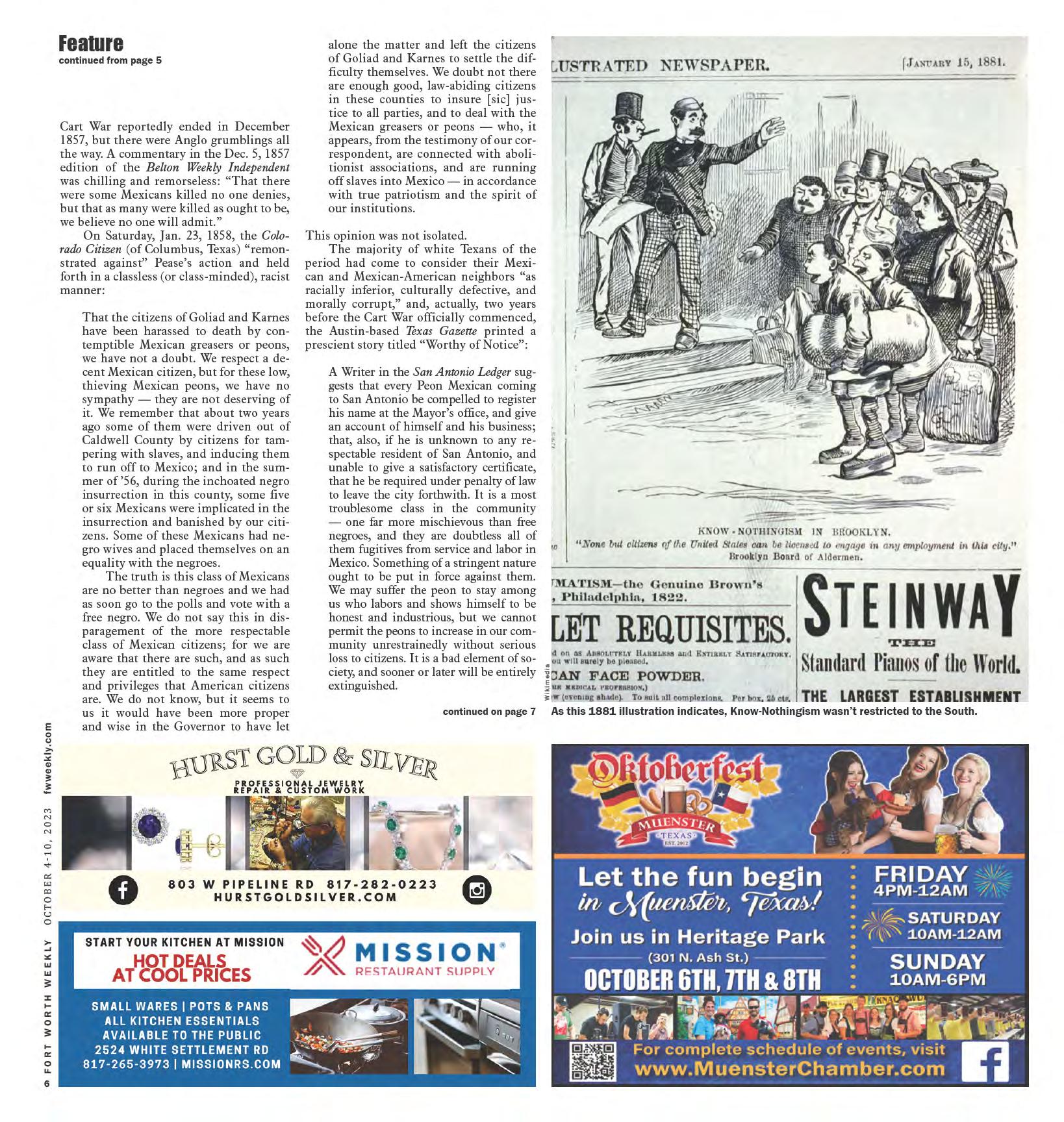 The so-called “Cart War” erupted in 1857 and had national and international repercussions. The underlying causes of the event, historians believe, were ethnic and racial hostilities of Texans toward Mexican Texans, exacerbated by the ethnocentrism of the Know-Nothing party and the White anger over Mexican sympathy with Black slaves.