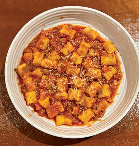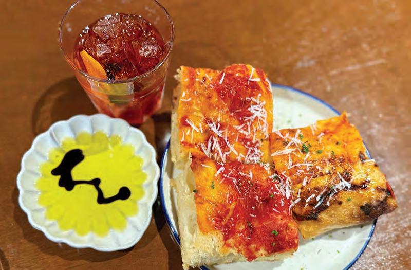 On the antipasti portion of the menu, I wanted to skip the popular items (meatballs, bruschetta) for something new, something adventurous. Our server talked us into the focaccia rossa, due to its 48-hour fermentation process and because it’s made fresh daily. Pillowy bread with a layer of tomato sauce came with a plate of oil and balsamic continued on page 21