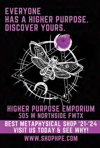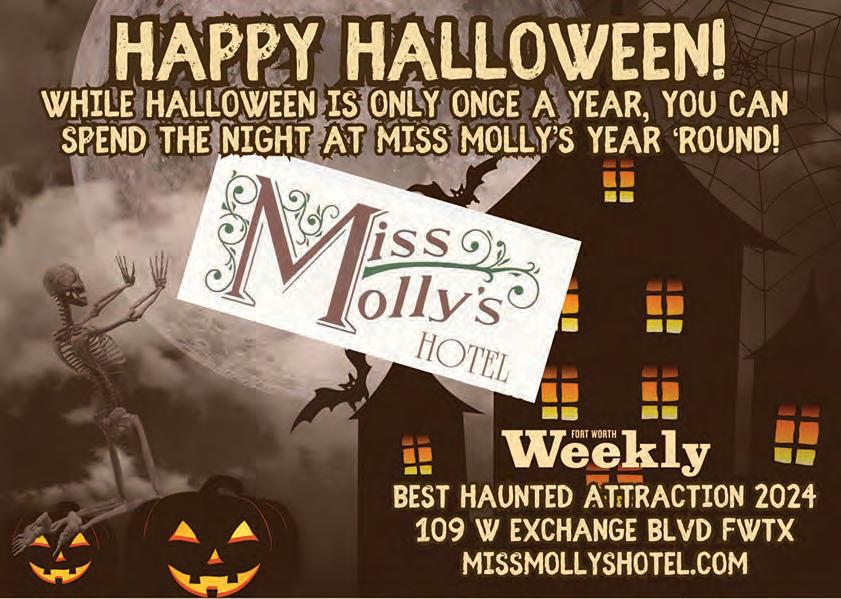 If you enjoy traveling and checking out para normal experiences, Your Haunted Holiday (@YourHauntedHoliday5985) is worth a lis ten. Hosted by twin sisters Lisa and Lindsay Estes, this podcast specializes in travel re views with a paranormal spin. New episodes come out every Sunday wherever you stream podcasts and on YourHauntedHoliday. com. Miss Molly’s Hotel (109 W Exchange Blvd, Fort Worth, 817-626-1522), this year’s critic’s choice for best haunted attraction, is featured in Episode 33.