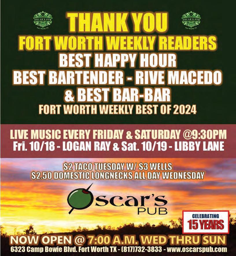 Kick off your Halloween weekend with a movie night at TX Whiskey Ranch (2601 Whiskey Ranch Rd, Fort Worth, 817-8409140), home of the 2024 critic’s choice for best distillery. On Fri, Oct 25, from 6pm to 9pm, Hocus Pocus, the 1993 comedy starring Bette Midler, Sarah Jessica Parker, and Kathy Najimy as a coven of evil (and silly) witches, will screen rain or shine. Bring your own blankets and chairs in case it’s outside. There will be a food truck onsite and a palm/tarot card reader available for complimentary sessions. Tickets are $10 at TXWhiskey.com and include your first cocktail. 21+ only. Doors open at 6pm, and the movie starts at 7pm sharp.