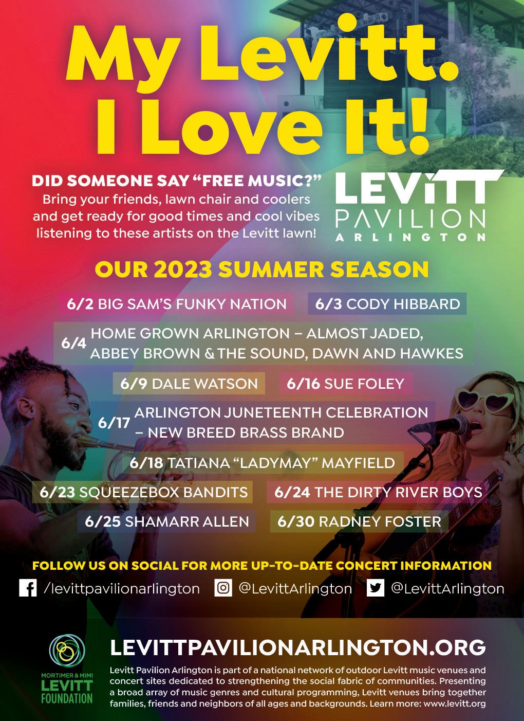 As part of a "music-friendly community," Levitt Pavilion Arlington (100 W Abram St, 817-543-4308) hosts free concerts called Arlington Celebrates: Home Grown. Featured artists for June include Big Sam’s Funky Nation on 6/2, Dale Watson with Dusty Moats on 6/9, Sue Foley with Terraplane Rounders on 6/18, SqueezeBox Bandits with Shelby Bellender on 6/23, and Radney Foster with Gold Pine on 6/30. For more info, visit LevittPavilionArlington.org.