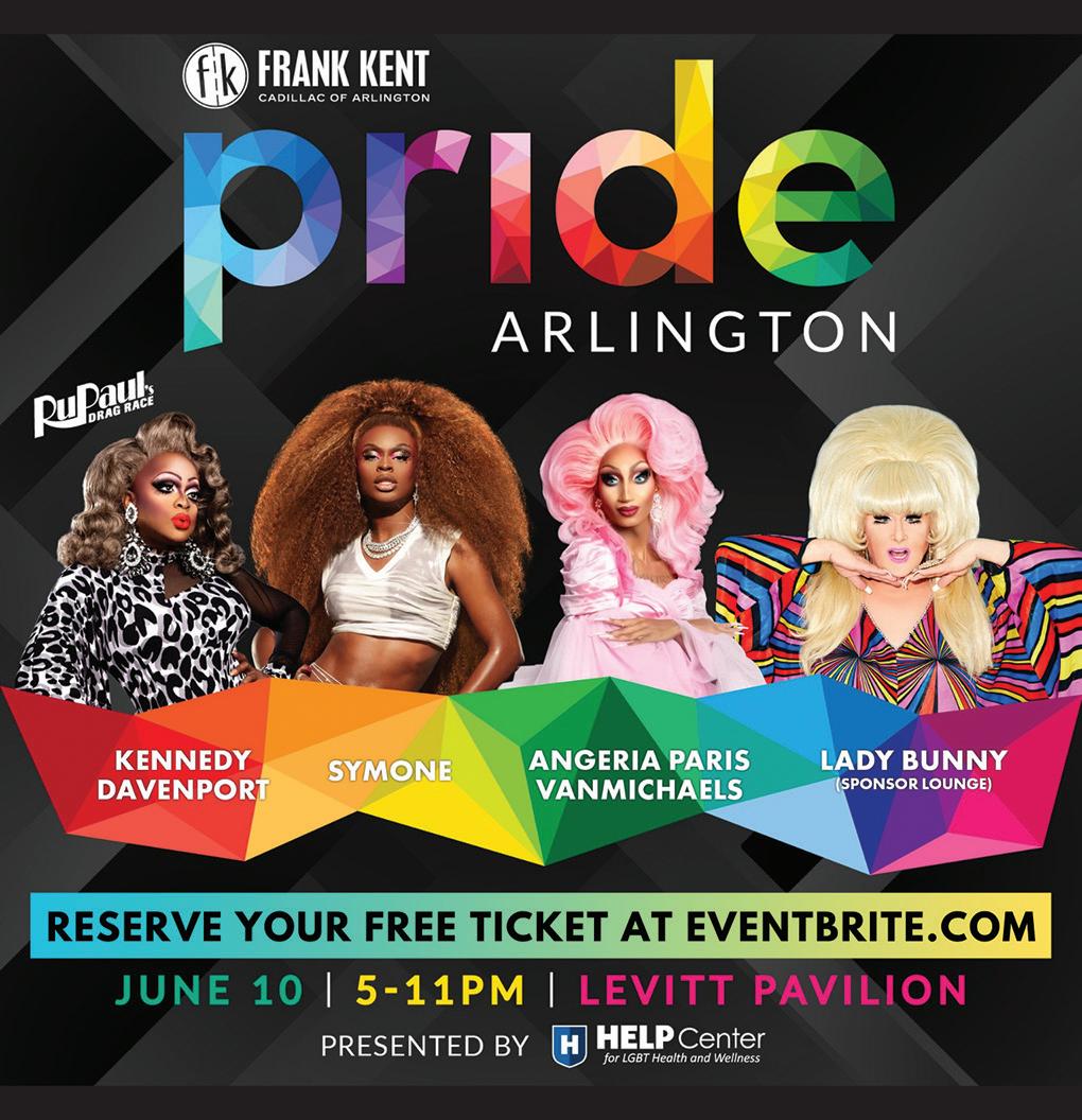 Arlington Pride 2023, presented by Frank Kent Cadillac and the HELP Center for LGBT Health & Wellness, is at the Levitt Pavilion (100 W Abram St, 817-543-4308) 6pm-11pm Sat, June 10. Featured performers from Ru Paul's Drag Race include Angeria Paris VanMichaels, Symone, and Kennedy Davenport, plus music by DJ Al Farb and a street fair full of vendors. Learn more at ArlingtonPride.org.