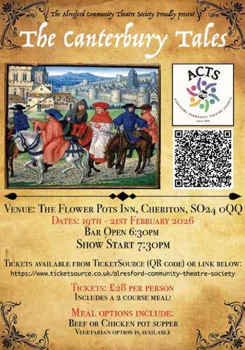 The Alresford Community Theatre Society proudly presents the Cantebury Tales at the Flower Pots Inn, Cheriton, SO24 0QQ. Bar opens 6.30pm, show sarts 7.30pm. Tickets available from ticket source: https://www.ticketsoource.co.uk/ alresford-community-theatre-society Tickets: £28 per person.