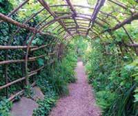 The Queen’s Herber is a trellised corner with a floor of mixed wild flowers, turf seats and octagonal table. Queen Eleanor’s Coat of Arms is on the door arch. There is a wall turf seat as commonly seen in manuscripts of the time, and a bench made from 200 year old oak and adapted from a nine foot long gothic bench in Winchester Cathedral. The Pentice could have connected the kitchens to the Great Hall and its oak shingles show how the Hall would have been roofed. All the plants, mostly native, would have been grown in 13th century gardens.