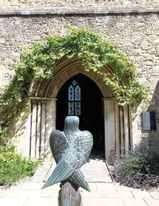 in the Great Hall, the fountain is copied from the tomb of Peter de Sancta Mario, 1296, in St Cross Hospital, and old stone paving has been incorporated. The details of the lead pool, bronze leopard heads and falcon are developed from a description of a fountain at Charing Cross Mews, written in 1272. The falcon has details taken from the unique wooden falcon, carved about 1305, in Winchester Cathedral choir stalls. A tunnel arbour is made from curved tree poles, tied together, supporting vines, roses and honeysuckle.
