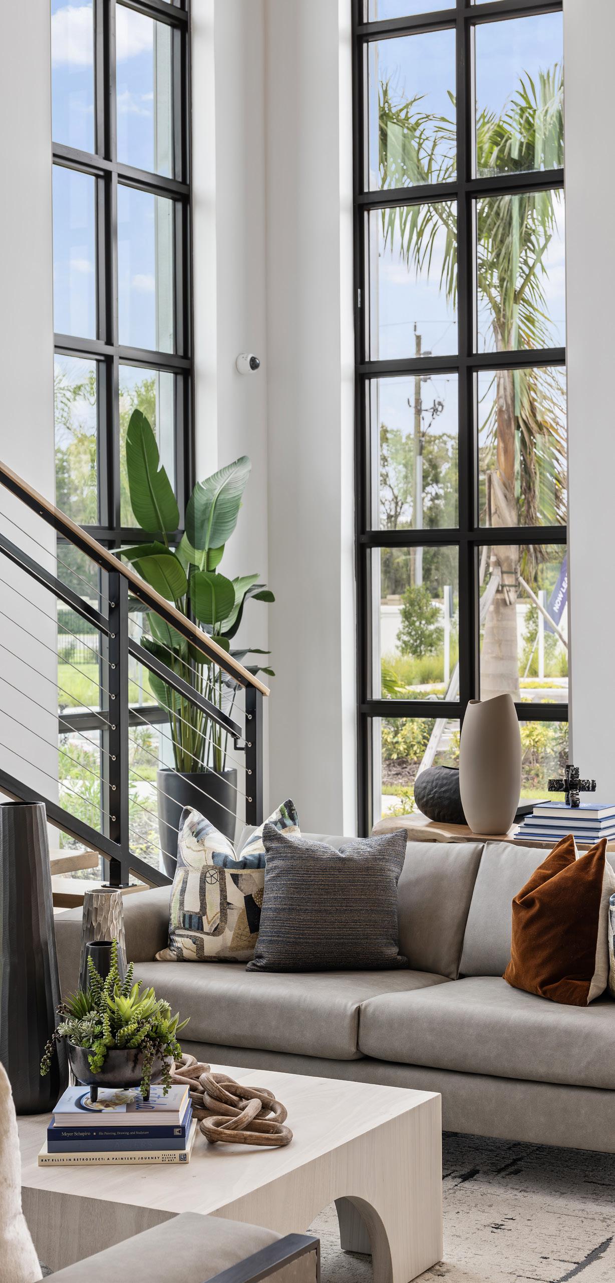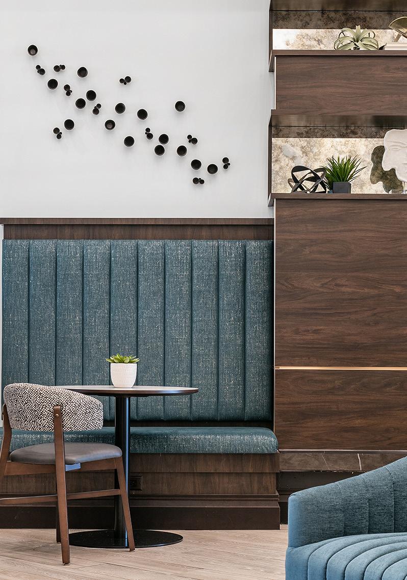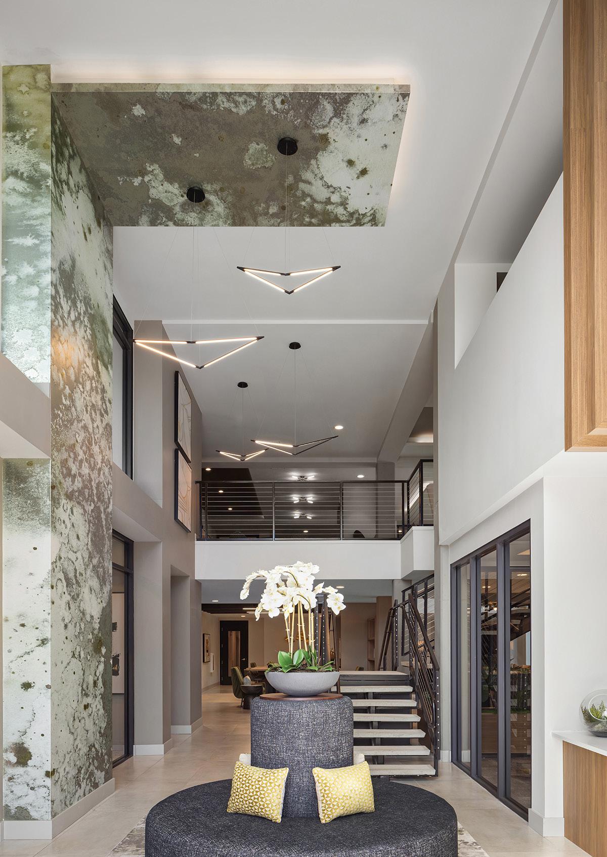 Experience the allure of elevated farmhouse style in this stunning space, where a doublestory vaulted ceiling invites you into a warm and bright lobby – concierge space. This open and airy entry is flanked by a modern architectural staircase, with industrial light fixtures illuminating the space. A harmonious blend of blues and greens, along with warm russet tones, adds layers of color, while metal accents of black and gold provide a touch of modern sophistication.