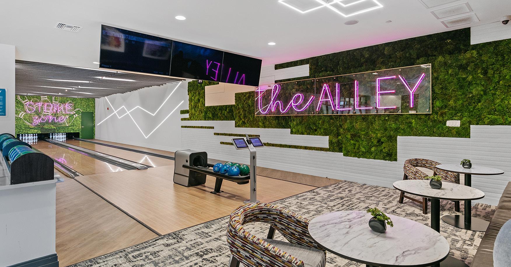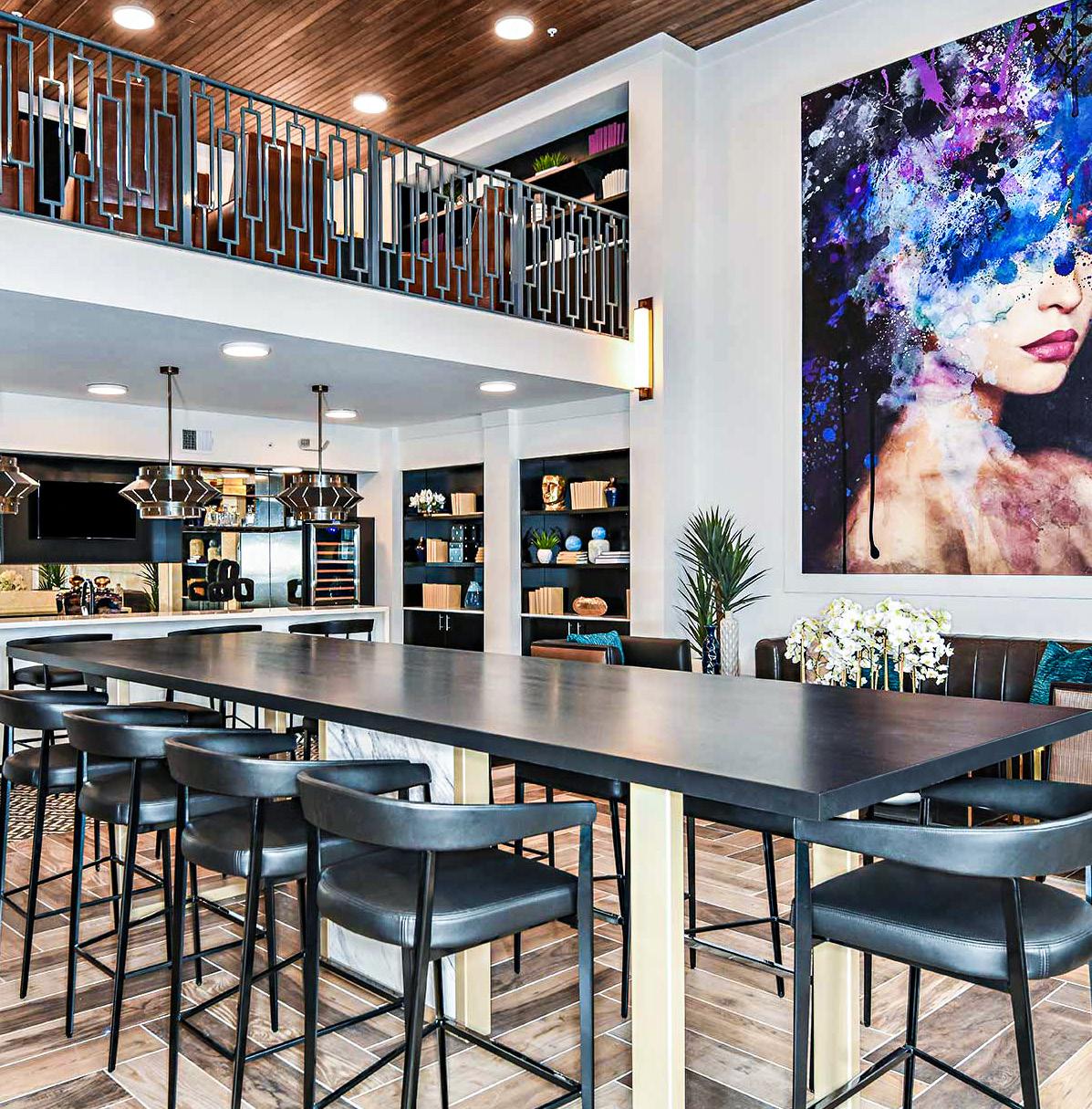Located in North Naples, Florida, Allura Apartments features a neutral color palette with pops of color inspired by Florida’s Emerald Coast. The interior design incorporates a mix of modern and high-end finishes and furnishings that complement the properties resort inspired amenities. With a ceiling height of over thirty feet, the ceiling design and large custom LED light fixtures brings the space a sense of grandeur while also maintaining a level of wellbeing and comfort. Thoughtful consideration of providing multiple areas for residents to plug-in were incorporated, from various banquette areas to the communal island and game room, providing the flexibility of work and play.