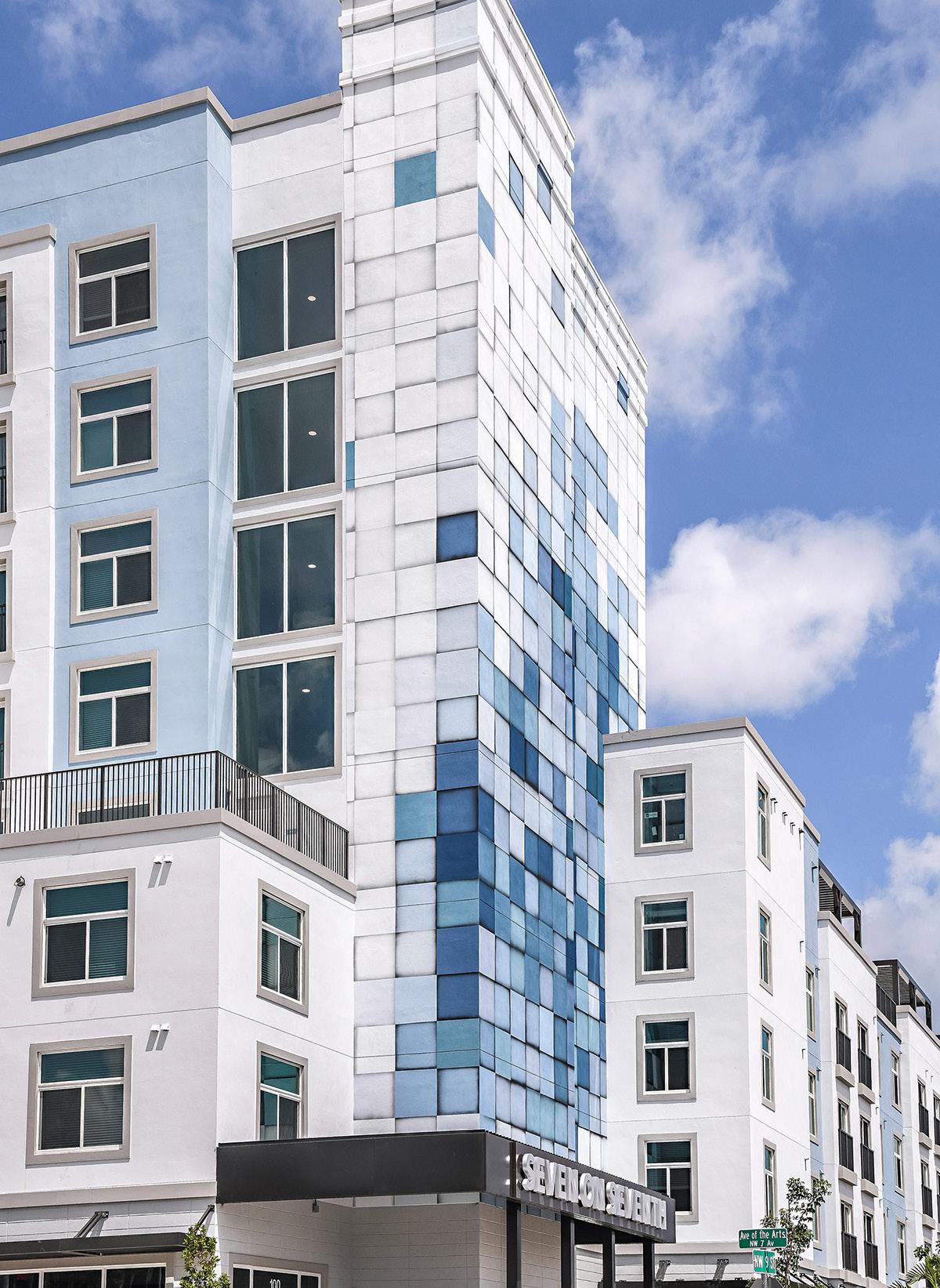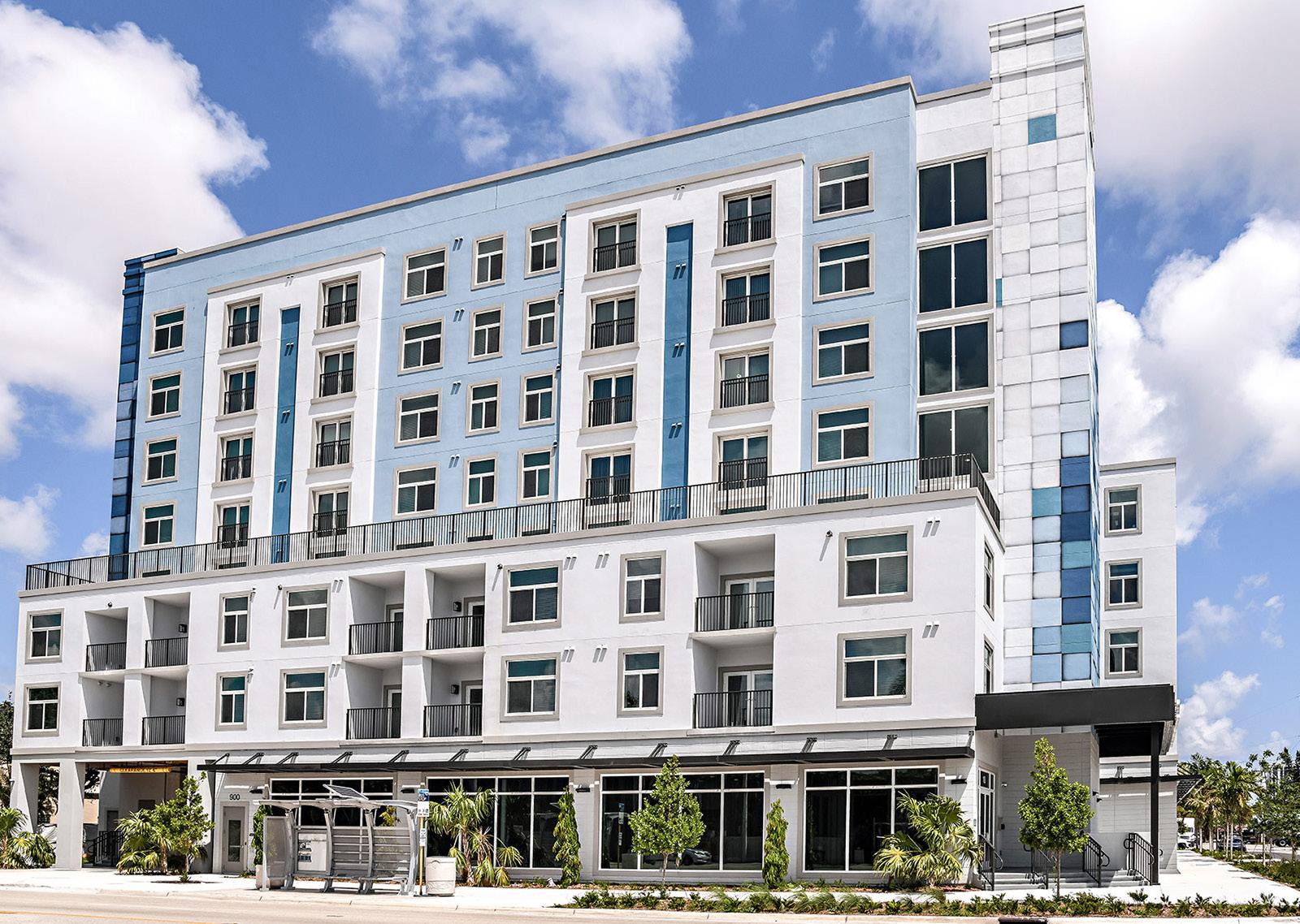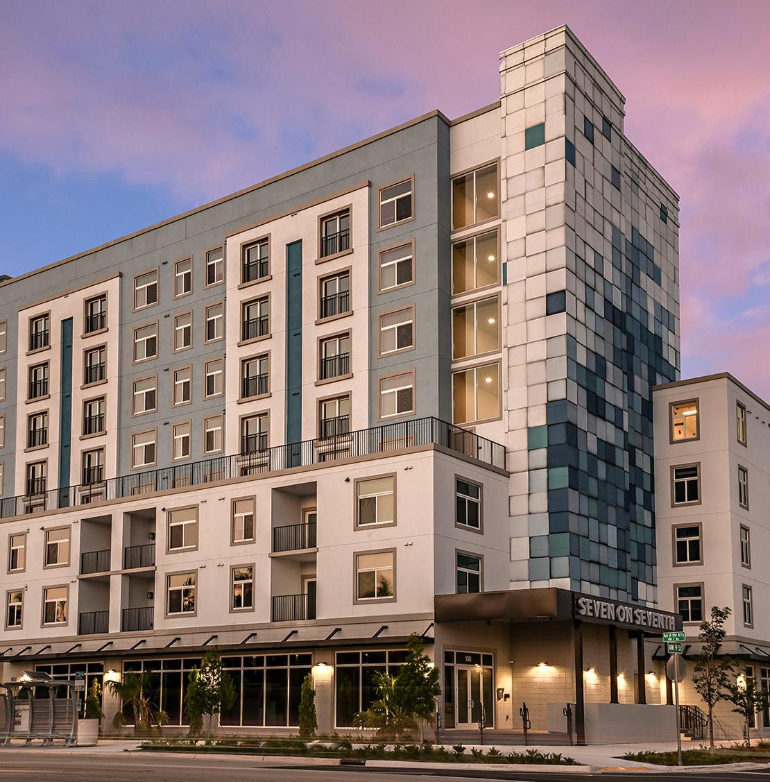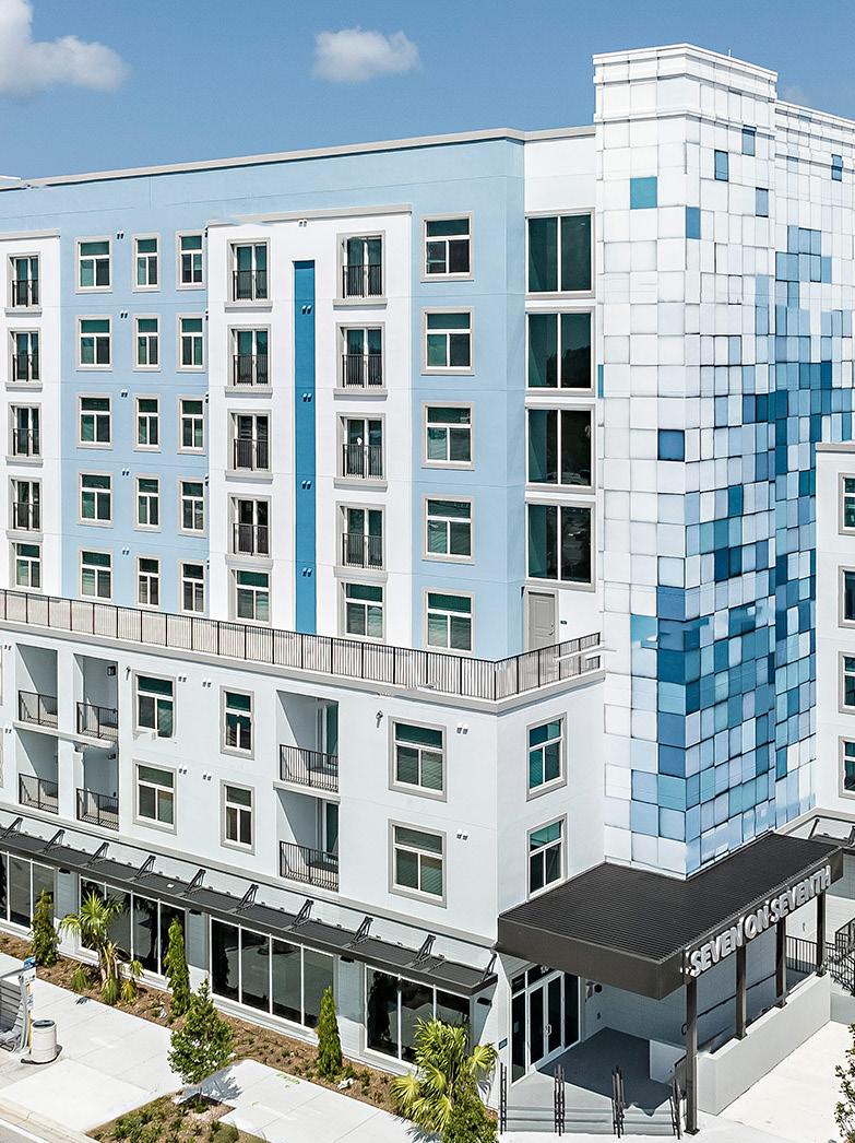 Seven on Seventh is a mixed-use affordable residential apartment community development in downtown Fort Lauderdale specifically designed for low-income and formerly homeless individuals and families. The building includes 72 residential units, ranging from studios to two-bedroom apartments. Amenities include a fitness center, interactive library, ground floor commercial space, case management and workforce program offices.