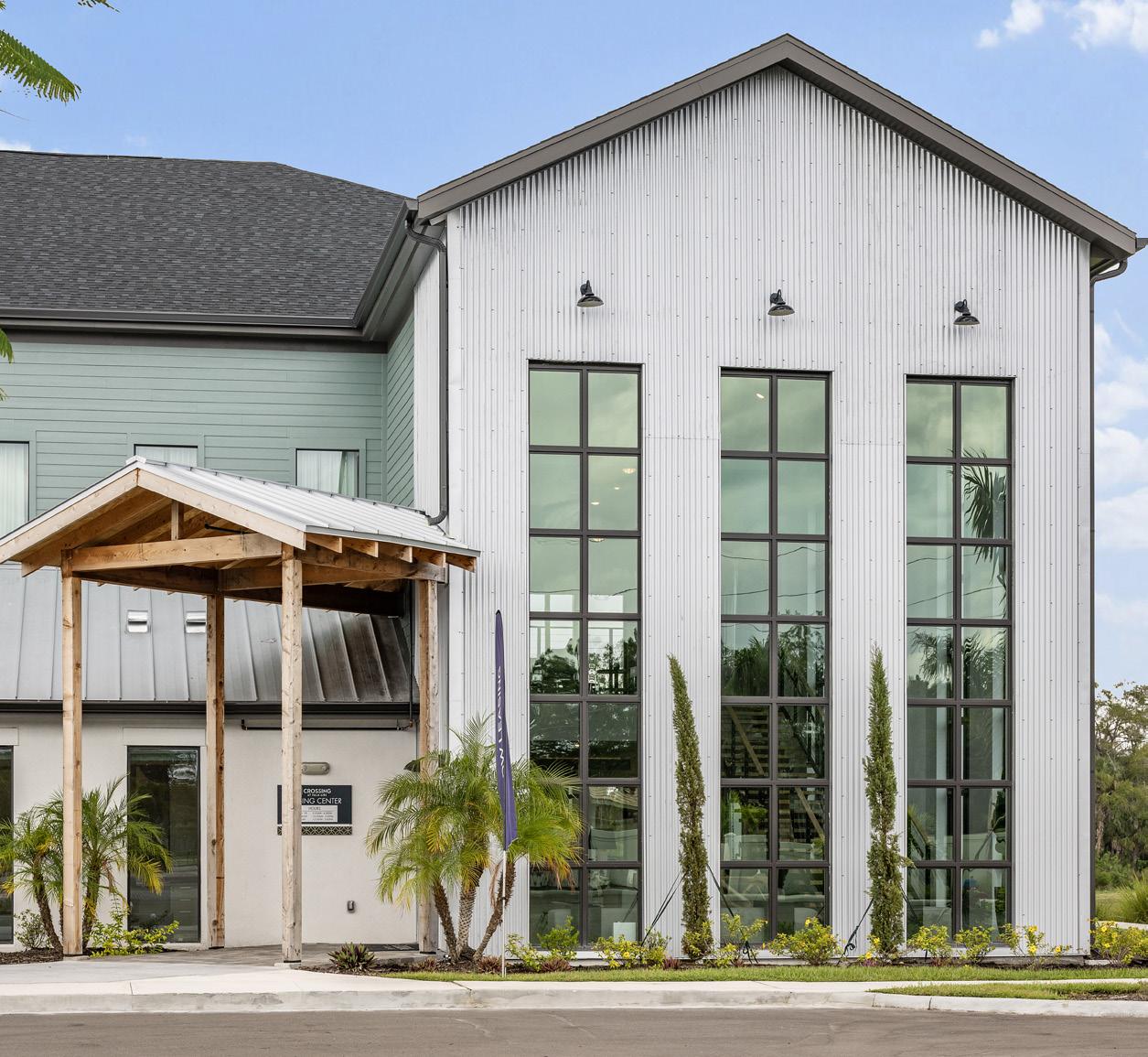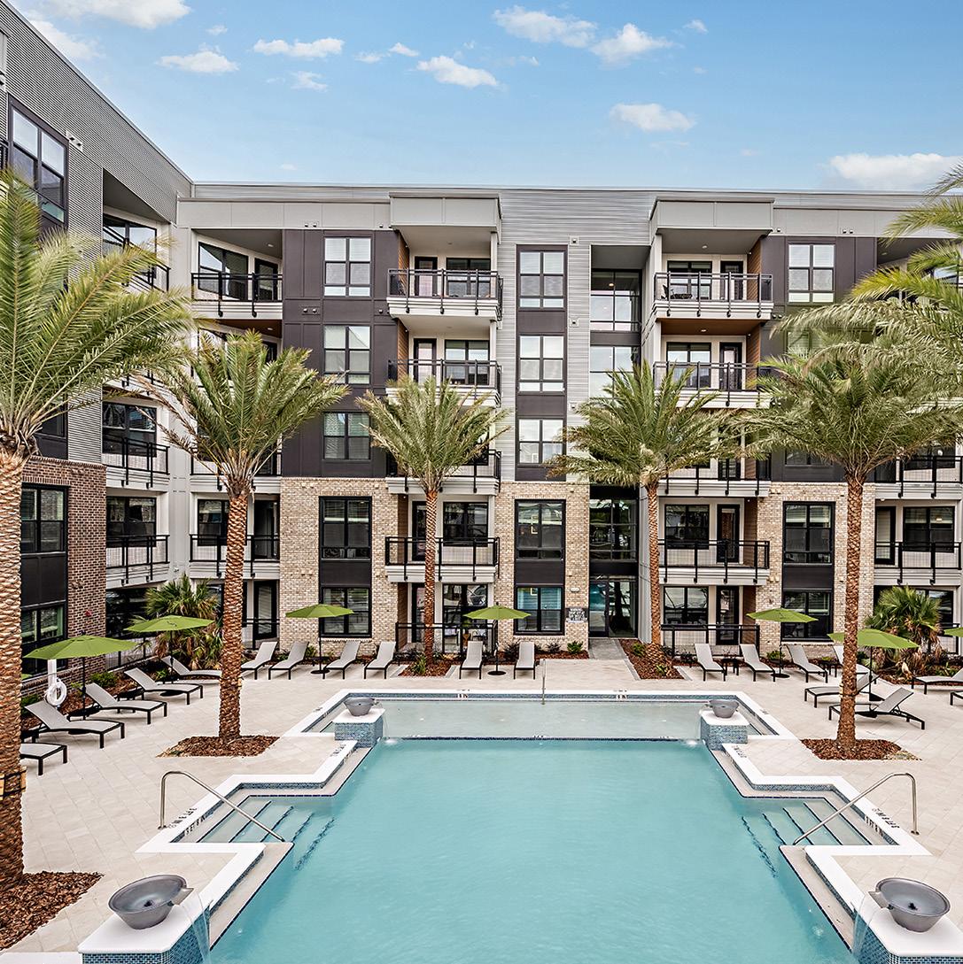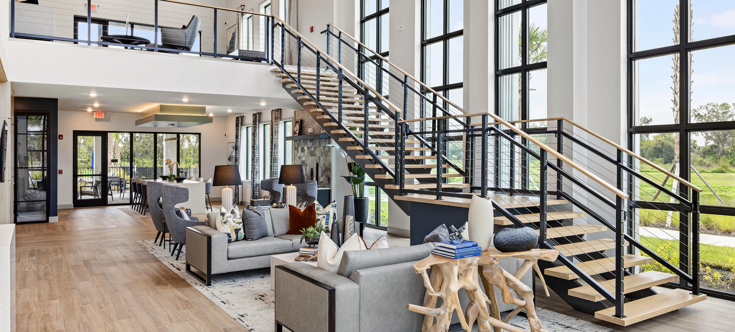 A captivating fusion of hospitality inspired elegance with industrial flare, The Aston at Town Center in Jacksonville, Florida features an elevated architectural aesthetic of earthy greens and inviting warm tones blended with the brick facades and black iron; a complimentary style for the area.