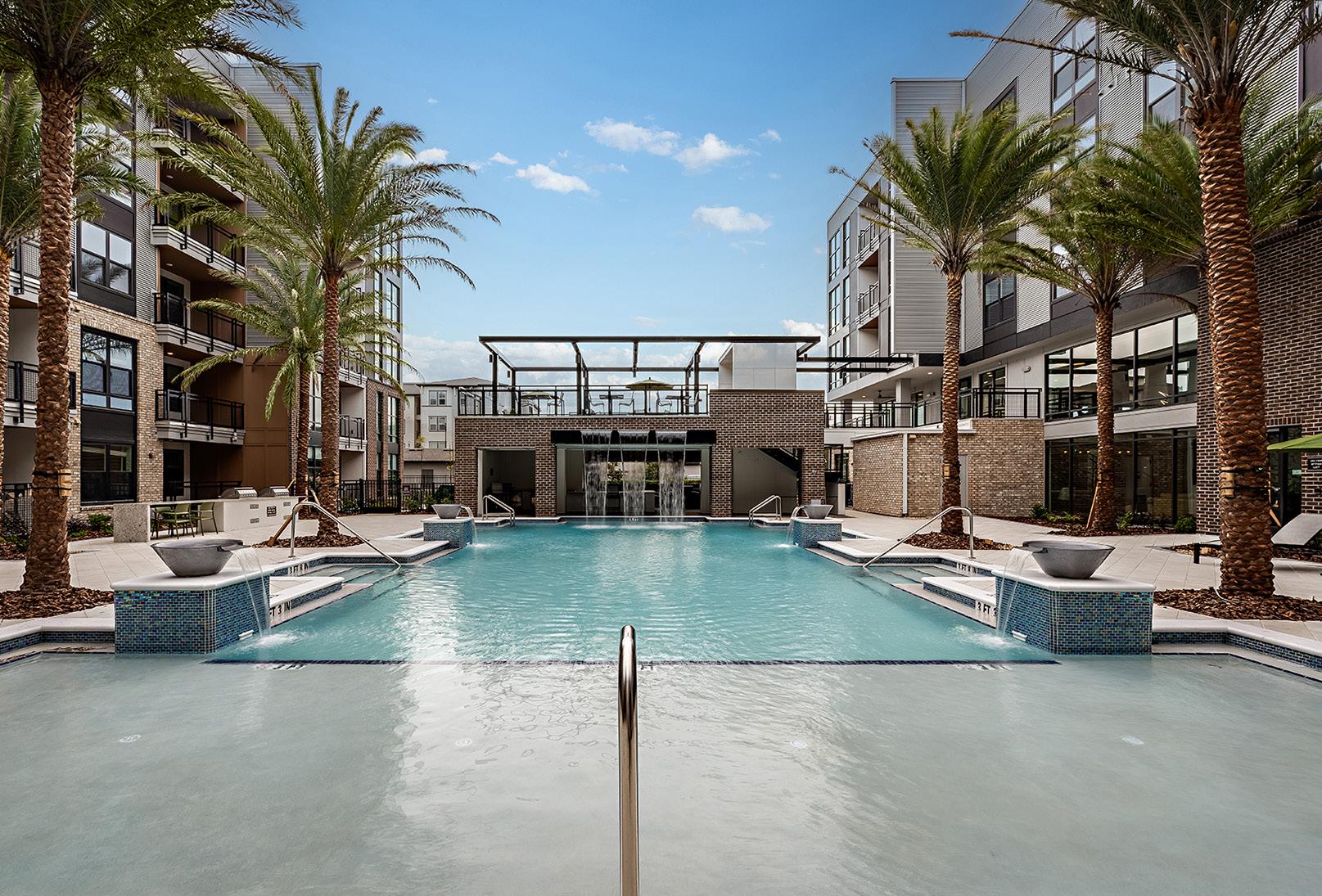 The two-story clubhouse employees double-height spaces in places like the main entry, the fitness center and a lounge that overlooks the pool and courtyard. Extending out of the clubhouse is a pool pavilion that has a rooftop deck with a custom designed water feature that cascades directly into the pool below.
