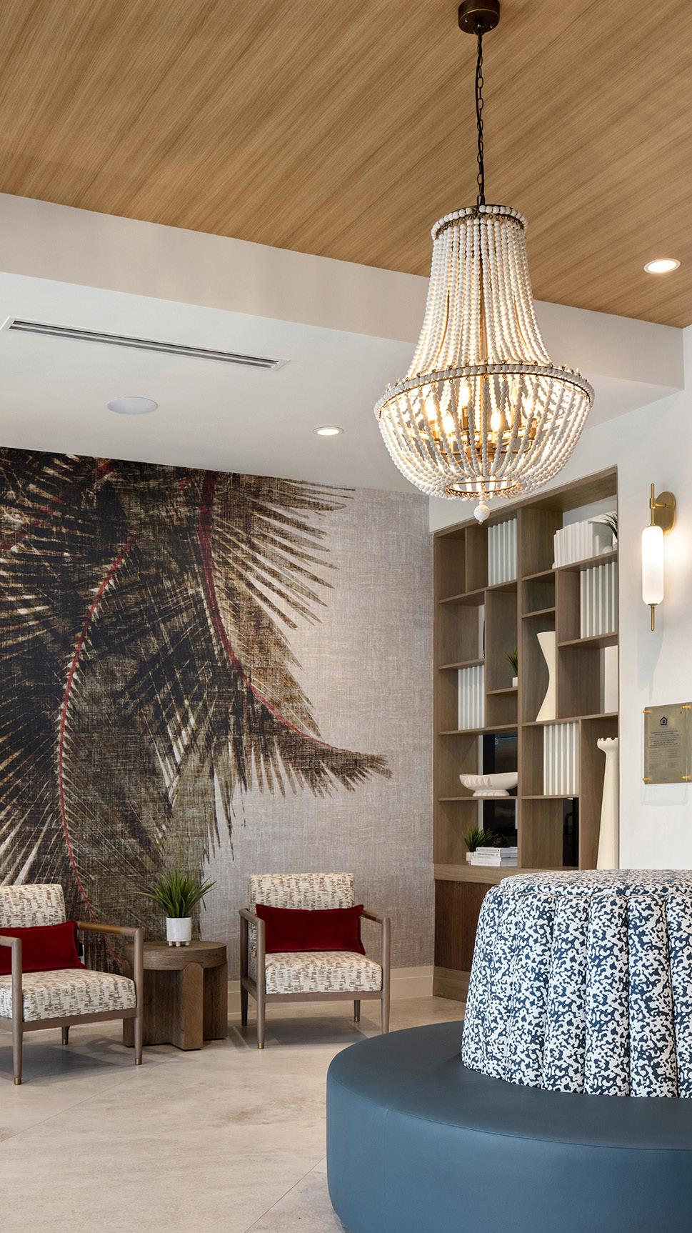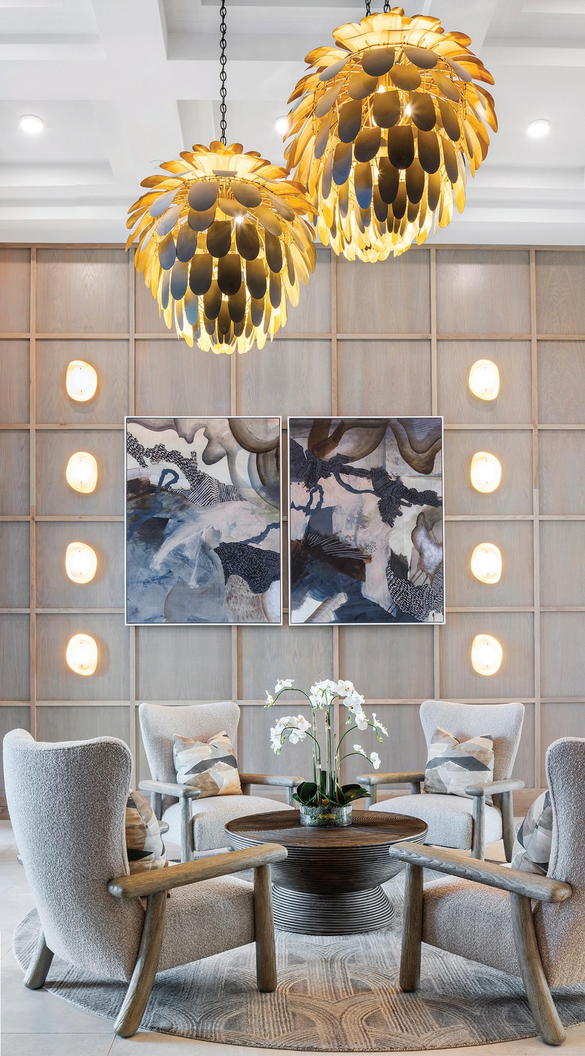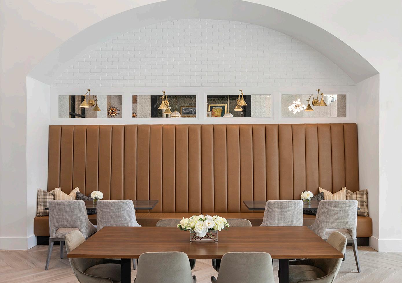 Residential-inspired, high-performance furnishings—including leather-embossed vinyl, textured tweeds, and woven suedes—create a comfortable, durable environment. Brass and black lighting, accent tables, and furniture bases add contrast and visual depth throughout.